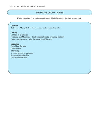 The document provides guidance for conducting an effective focus group to gather feedback on a music video idea. It recommends determining the key things to learn from the focus group. The document suggests starting the focus group by playing the song to provide context and then asking questions to gather ideas on the narrative, locations, casting, props, and how to visually convey the artist. Notes from the sample focus group feedback indicate the participants responded positively to the controversial topic and suggested locations, casting, and props to help tell the story.