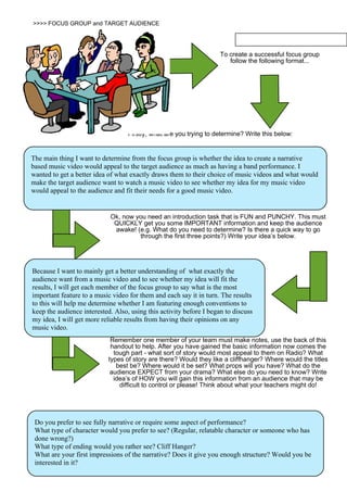 The document provides guidance for conducting a focus group to determine the appeal of a proposed music video concept to the target audience. It recommends: