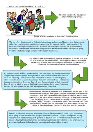 The document provides details on planning a focus group to gather feedback on a music video. It outlines introducing the focus group with a matching card game to get participants thinking about different aspects of music videos. It also describes using a group quiz game to collect important information from the focus group, such as their expectations and preferences for elements of the music video like narrative, techniques, and setting, in a more relaxed and informal way. The focus group aims to determine if the creator's narrative and techniques would appeal to the target audience and whether they would watch the music video.
