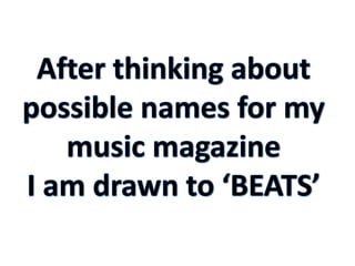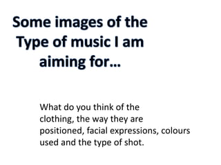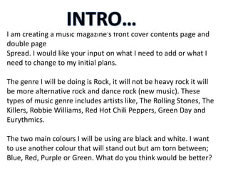 The document discusses plans for a music magazine cover focusing on alternative rock and dance rock genres. It seeks input on color choices for the cover, with options of blue, red, purple or green. It also asks for feedback on text options, layout positioning, and number of articles to include on the front cover.
