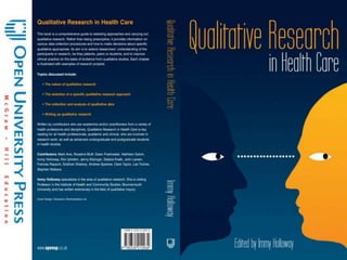 The document discusses the purpose and methodology of focus group research, highlighting its effectiveness in exploring participants' opinions, experiences, and beliefs through group discussions. It contrasts focus groups with individual interviews and quantitative methods, emphasizing their qualitative nature and ability to reveal nuanced insights. Additionally, the document outlines key factors for conducting focus groups, including group composition, environment, and ethical considerations, while providing examples of their application in health education and service improvement.