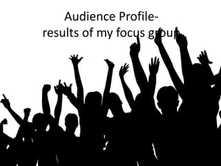 The document summarizes the results of a focus group conducted to understand the target audience for a new television soap opera. The focus group asked questions about the audience's media consumption habits, likes/dislikes of existing soaps, and opinions on social issues. Key findings included that the audience prefers realistic crime storylines set in the present day that feature relatable characters similar to themselves. They want the soap to avoid unrealistic plots and address issues like underage drinking and animal testing in a negative light.