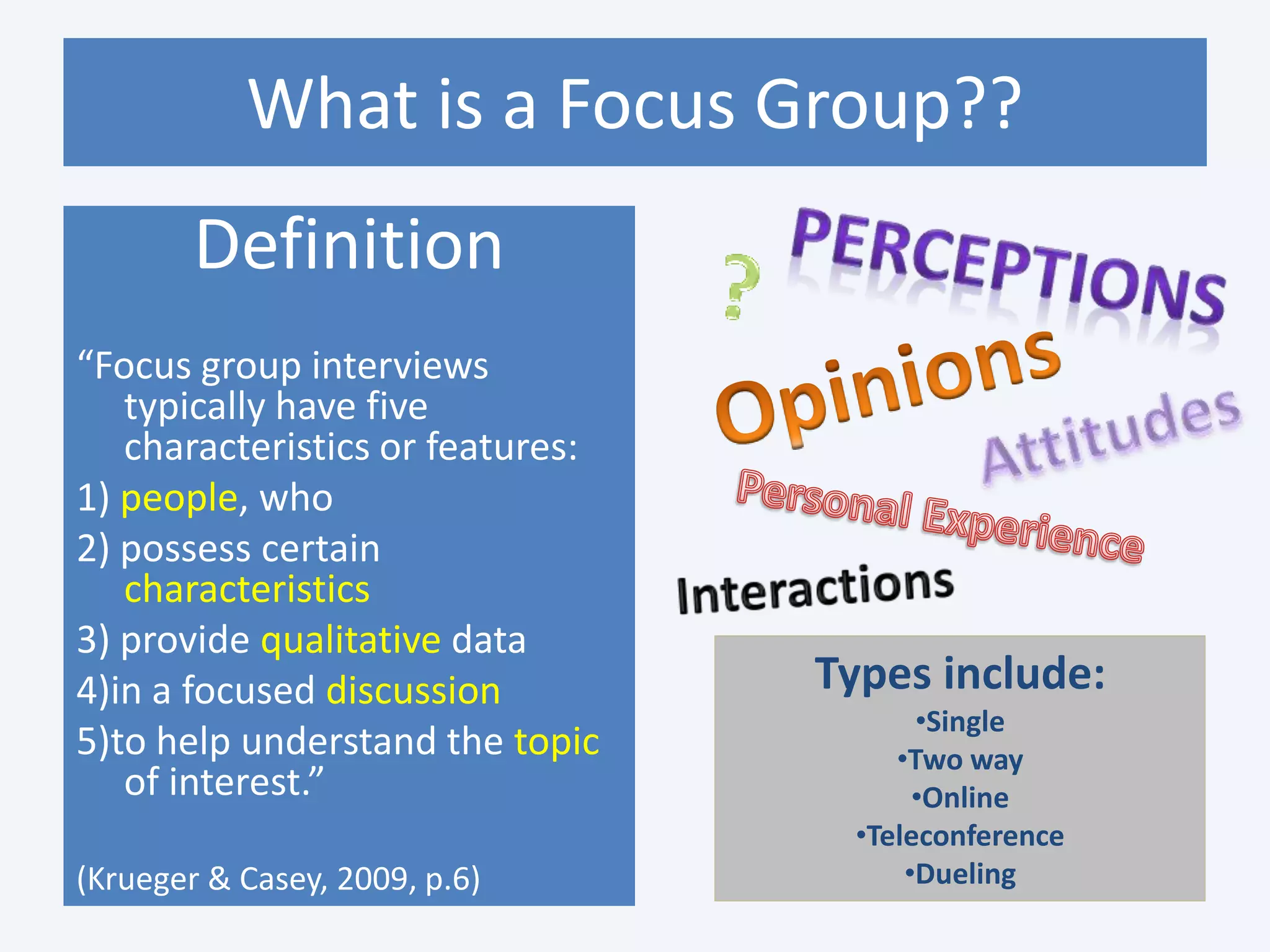 Focus groups are a qualitative research method involving a guided group discussion to explore views on a topic. They typically involve 5-10 participants and a moderator. Focus groups were developed in the 1930s and are now commonly used in marketing, business, and social sciences. They can help gather ideas, identify differences in perspectives, and pilot test policies. Effective moderators facilitate discussion, observe participants, and guide the conversation. Focus groups provide flexible, low-cost insights but results may be influenced by group dynamics. They show potential to study leadership, communication, and stakeholder engagement in organizations if more systematically analyzed.