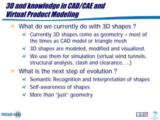 The document discusses the evolution of 3D shape modeling in CAD/CAE, emphasizing the need for semantic recognition and self-awareness of shapes beyond mere geometry. It introduces generative modeling language (GML) as a transformative approach that allows for high-level shape design by defining operations rather than static objects. Key challenges identified include the lack of links between 3D models and product properties, the complexity of mechatronic systems, and the necessity for better interoperability in simulation frameworks.