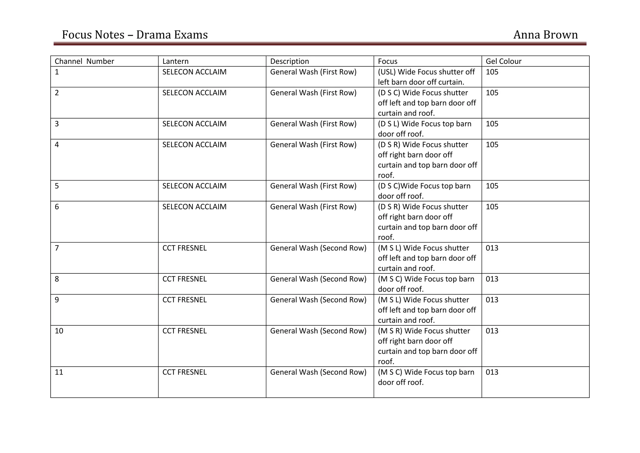 This document contains focus notes for lighting instruments used in a drama exam setting. It lists 48 lighting instruments including general washes, back lights, spots, side lights, and indoor practicals. Each instrument is identified by channel number, lantern type, purpose, focus, and gel color. The notes provide detailed instructions on shutter, barn door, and roof positioning for many of the instruments.