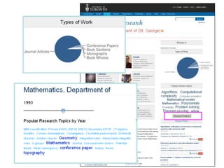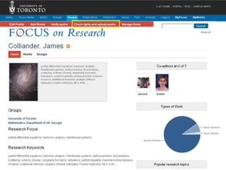 This document summarizes two research profiling and preservation tools: Focus on Research and T-Space. Focus on Research allows faculty to create online research profiles highlighting publications and activities. It integrates with other websites and includes tools to import publications. T-Space is an institutional repository that allows scholars to preserve and distribute research in various digital formats with persistent access. The two tools work together, with Focus populating research profiles and T-Space archiving full-text works. They provide benefits like increased access, citation rates, and preservation of scholarly output for faculty and the university community.
