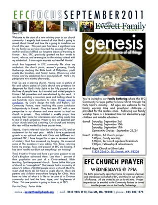 This document is a newsletter from Pastor Mike of Everett Family Church (EFC) providing updates on church activities and events over the past month and upcoming in September. It discusses Pastor Mike's sabbatical in France which renewed his vision and passion for ministry at EFC. It also highlights successful youth events over the summer and upcoming community activities like prayer meetings, Family Gatherings, and New Horizons serving the homeless.