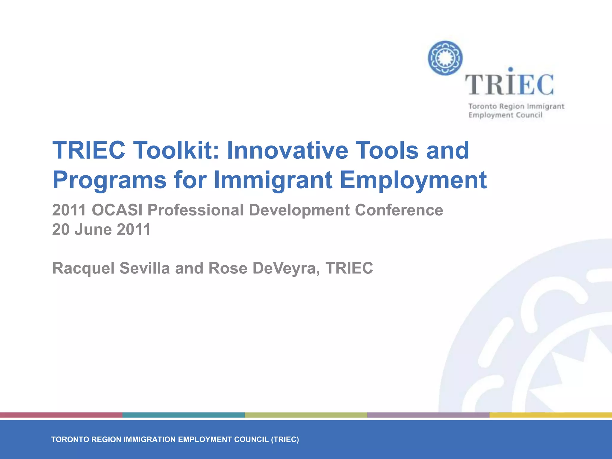 The Toronto Region Immigrant Employment Council (TRIEC) convenes partners to create solutions for integrating skilled immigrants into the Greater Toronto labor market through programs that work with individuals, organizations, governments, and Professional Immigrant Networks (PINs) to help immigrants connect to employment opportunities and develop professional skills and networks. TRIEC provides resources for PINs, employers, agencies, and immigrants including workshops, videos, guides, and an e-learning platform to build cultural competence and facilitate hiring and integrating skilled immigrants.