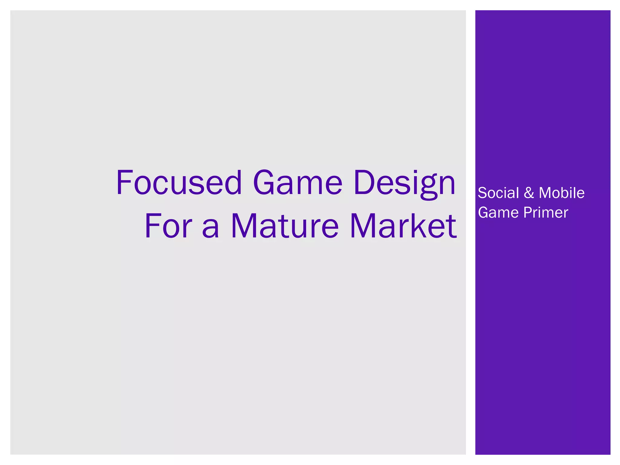 This document provides guidance for designing social and mobile games for a mature market. It discusses key elements like fun factor, investment, engagement, virality, and monetization that drive player retention and business success. It emphasizes designing elegant game mechanics and features that thoughtfully connect and reinforce each other to provide a cohesive player experience and business model.