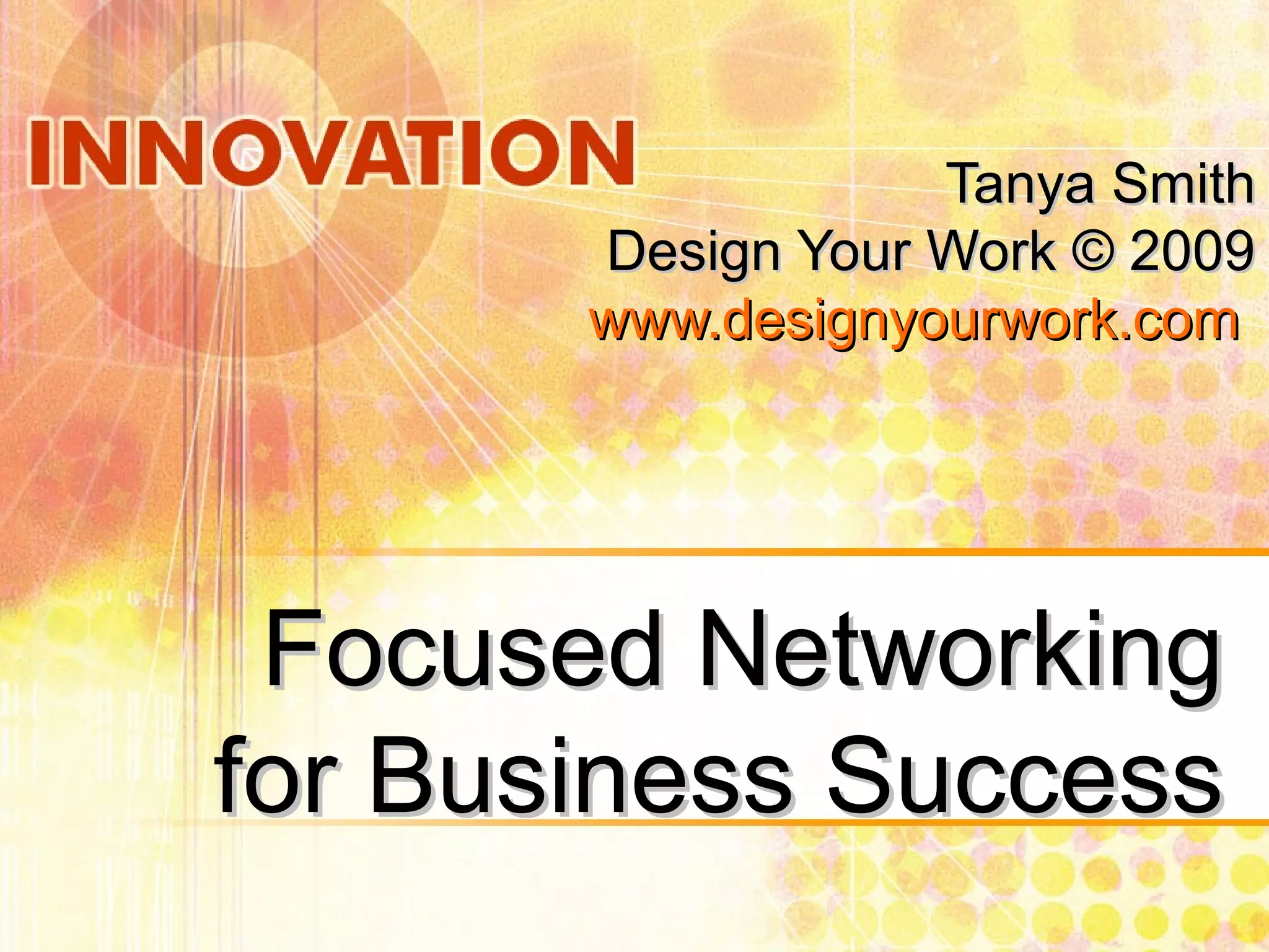 The document discusses focused networking as a strategic approach to building business connections intentionally, emphasizing its importance for professional success. It outlines the difference between traditional and social media networking, highlighting how effective relationships can lead to credibility, leads, and sales. Tanya Smith, a career coach, provides insights into utilizing social media and traditional methods to grow and sustain professional relationships.