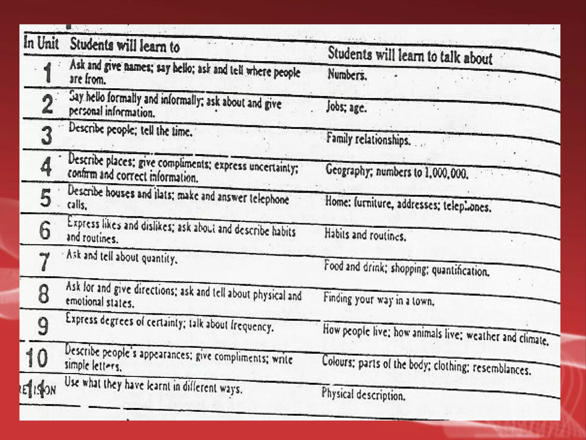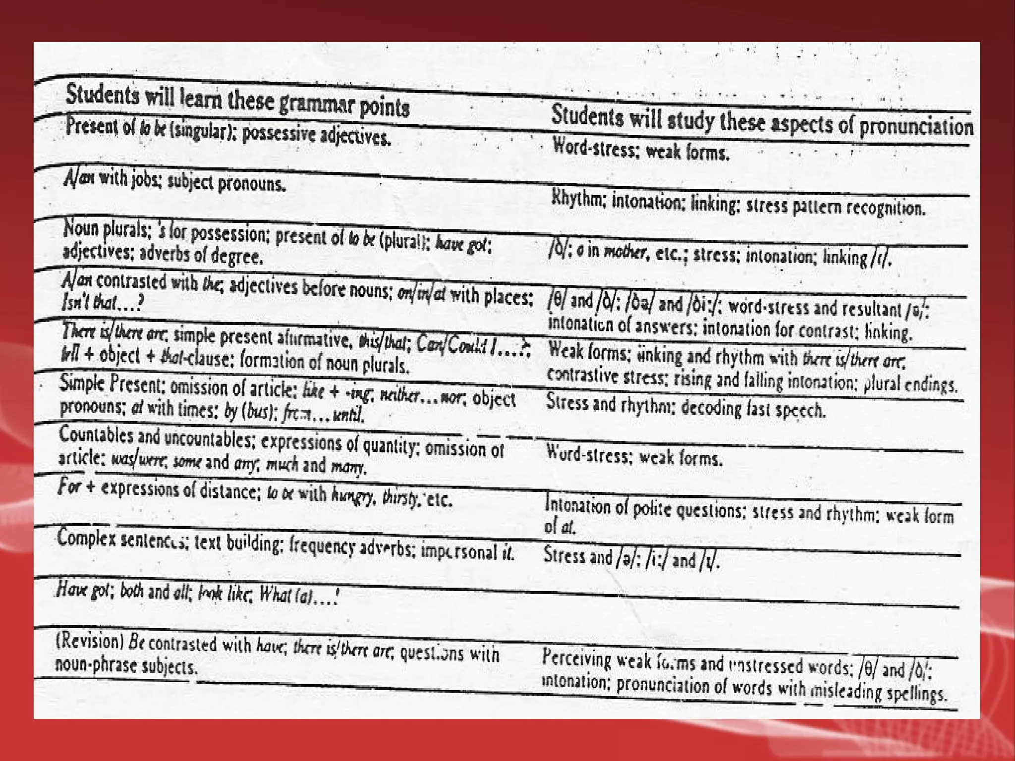 2) Inventories of grammatical topics, notions, functions and sociocultural contexts should be developed to provide appropriate sequencing and cultural contextualization.