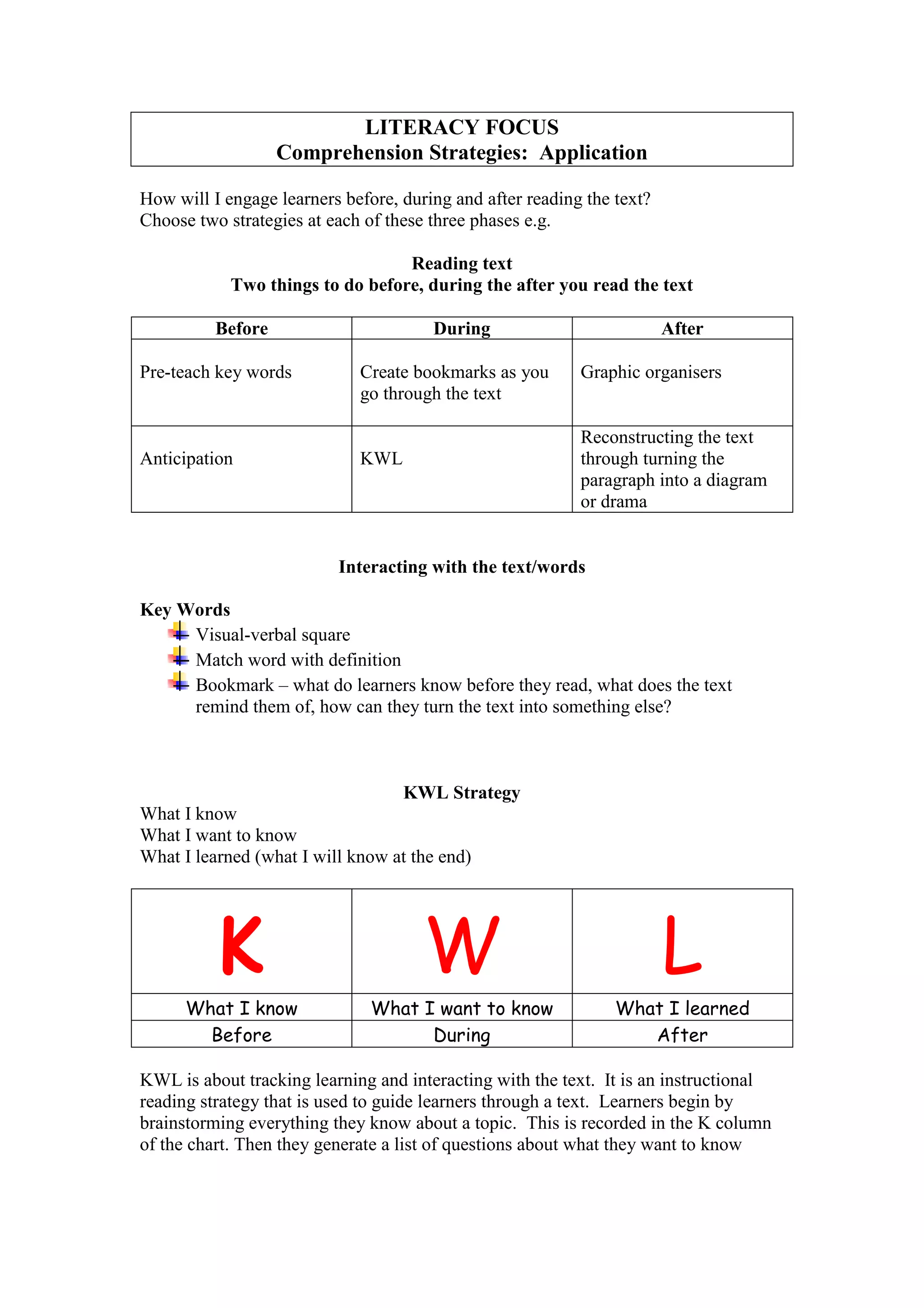 This document provides guidance on comprehension strategies to use before, during, and after reading a text. It recommends choosing two strategies for each phase, such as using graphic organizers or KWL charts before reading, interacting with the text through key words or visual representations during reading, and reconstructing or extending the text after reading. Specific strategies discussed in more detail include KWL, QuADS, 3-2-1, anticipation guides, SQ3R, and various exercises for interacting with and understanding texts like highlighting, cloze passages, sequencing, and matching headings to paragraphs. The document also covers spoken language strategies to promote exploratory talk and higher-order thinking when discussing texts.