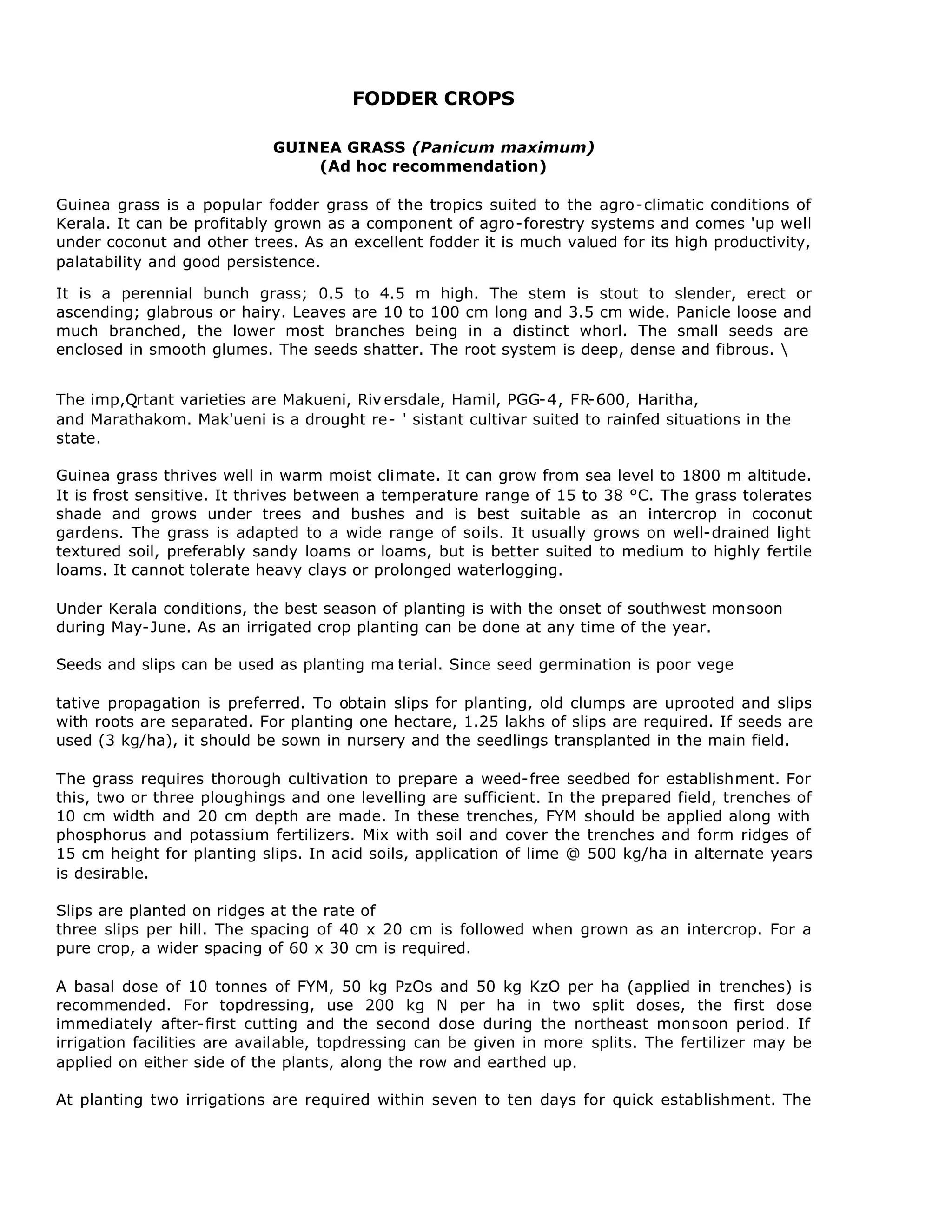 Guinea grass, Gamba grass, Setaria grass, and Hybrid Napier are popular fodder grasses suited for the agro-climatic conditions of Kerala. Guinea grass thrives in warm, moist climates from sea level to 1800m altitude, tolerates shade, and is well-suited as an intercrop. It provides high yields and is nutritious for livestock. Gamba grass tolerates drought and seasonal flooding. Setaria grass grows well with annual rainfall over 750mm and a temperature range of 20-25°C. Hybrid Napier was developed as a cross between Napier grass and bajra to combine high yields with fine texture, palatability, and drought resistance.