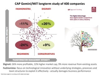 The document discusses emerging trends in digital marketing and technology in 2013. It notes that companies taking an agile, adaptive approach to marketing ("Digirati") are 26% more profitable and have higher market values. However, some "Fashionistas" focus too much on new technologies without changing underlying strategies and processes. Large companies like Google, Apple, Facebook, and Amazon are expanding into new areas through their control of hardware, operating systems, content platforms, and payment systems. The future of marketing involves enhancing customer experience through contextual data and seamlessly integrating customer touchpoints. Agile development practices that rapidly deliver value to users will be important, informed by data and user feedback. Innovation strategies should balance incremental, existing improvements with riskier