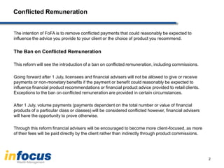 The Fofa reforms aim to eliminate conflicted remuneration in financial advice by banning commissions and payments that could influence product recommendations starting July 1. Employers of financial advisers are prohibited from providing conflicted remuneration, including bonuses and other forms of non-monetary benefits, with specific considerations required for performance benefits to ensure compliance. Practices must prepare by identifying commission revenue, maintaining an accurate register of non-monetary benefits, and reviewing any alternative remuneration to avoid conflicts.