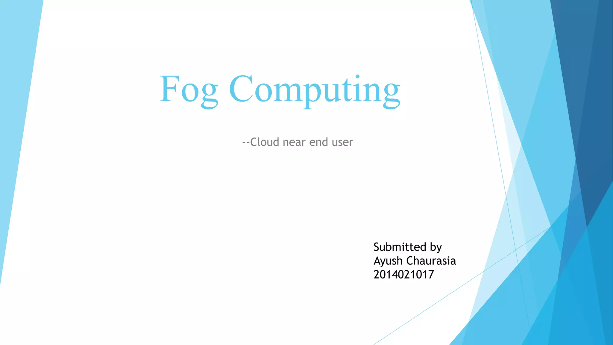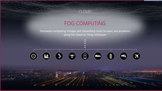 Fog computing, introduced by Cisco in 2014, decentralizes computing, networking, and storage resources closer to end users to reduce bandwidth usage and lower latency. It consists of a hierarchical framework with fog nodes at the edge, facilitates resource management, load balancing, and addresses significant security and privacy concerns, including mitigation strategies for attacks like MITM. The future includes new service models like fog-as-a-service (FaaS) and expanded applications in various industries.