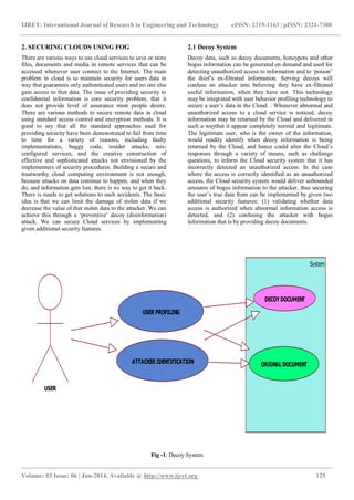 This document discusses fog computing as a new technique to provide security in cloud computing environments. It proposes using fog computing to extend cloud computing by placing user data closer to the end user and providing additional security features like validating authorized data access and confusing attackers with decoy documents. The key idea is to minimize damage from stolen data by decreasing its value to attackers through disinformation like decoys. This technique aims to make cloud systems more secure and transparent to users.