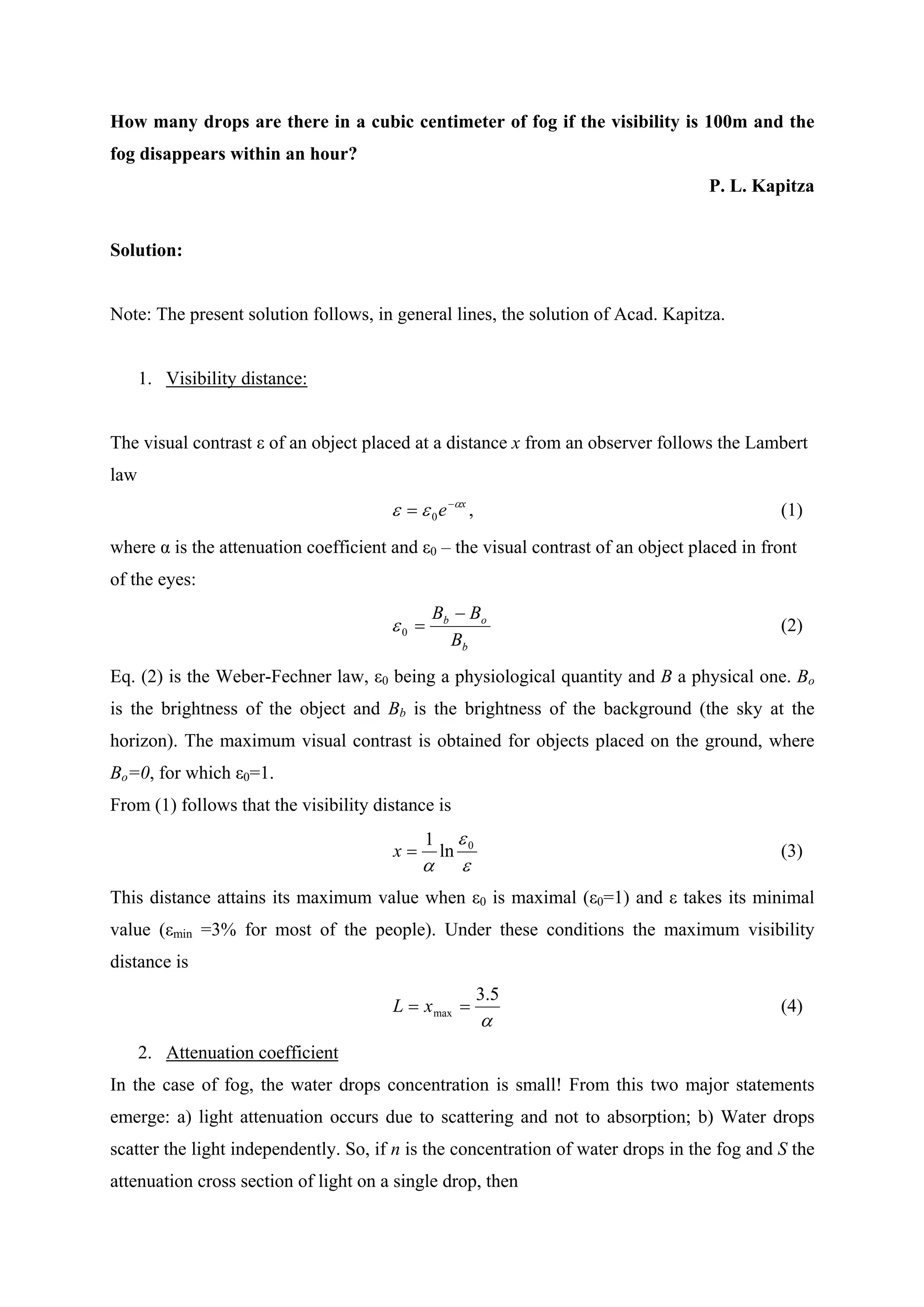 The document provides a solution to calculate the number of drops in a cubic centimeter of fog given the visibility is 100m and the fog disappears within an hour. It outlines the following steps: