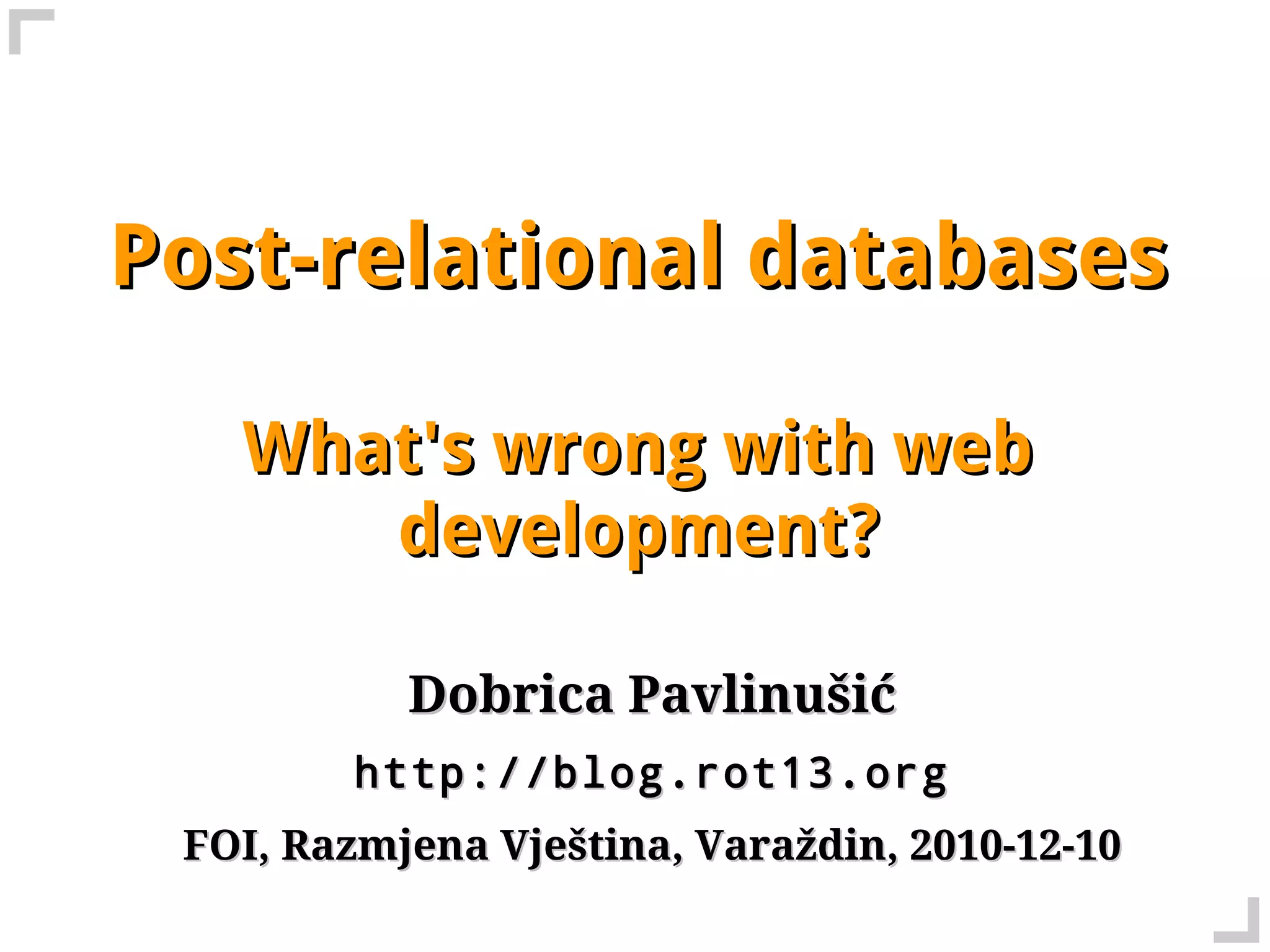 This document discusses post-relational databases and how they have evolved over time from mainframes to the modern web. It focuses on NoSQL databases like CouchDB and Riak that use JSON and are well-suited for web applications. CouchDB allows for asynchronous processes through triggers and offline applications through replication. AngularJS is highlighted as a way to build applications with CouchDB that avoid complexity through the use of JSON, HTML templates, and JavaScript controllers.