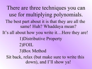 The document provides instructions for multiplying polynomials using three methods: the distributive property, FOIL (First, Outer, Inner, Last), and the box method. FOIL is only used when multiplying two binomials, while the distributive property and box method can be used for any polynomials. Examples are provided to demonstrate multiplying polynomials of varying complexities using each method. Students are encouraged to practice the methods and choose the one they find easiest.