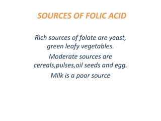 Folic acid is essential for one carbon metabolism and the synthesis of DNA, RNA, and proteins. Rich sources include green leafy vegetables and yeast. Deficiency can cause megaloblastic anemia and fetal neural tube defects. It is caused by inadequate intake, increased need during pregnancy, malabsorption, medications, and B12 deficiency trapping folate. Symptoms include fatigue, sore tongue, and neurological issues. Diagnosis involves blood tests of folate, B12, and homocysteine levels. Treatment is oral folic acid supplementation.