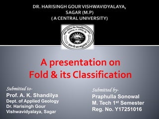 The document discusses the classification of folds based on various parameters such as fold closure, symmetry, plunge, orientation of the axial plane, and nature of the hinge line. Folds are classified into different types including antiform, synform, symmetrical, asymmetrical, horizontal, plunging, upright, recumbent, and overturned folds based on these parameters. The classification schemes proposed by Fluety (1964) and Ramsay (1967) are also summarized.