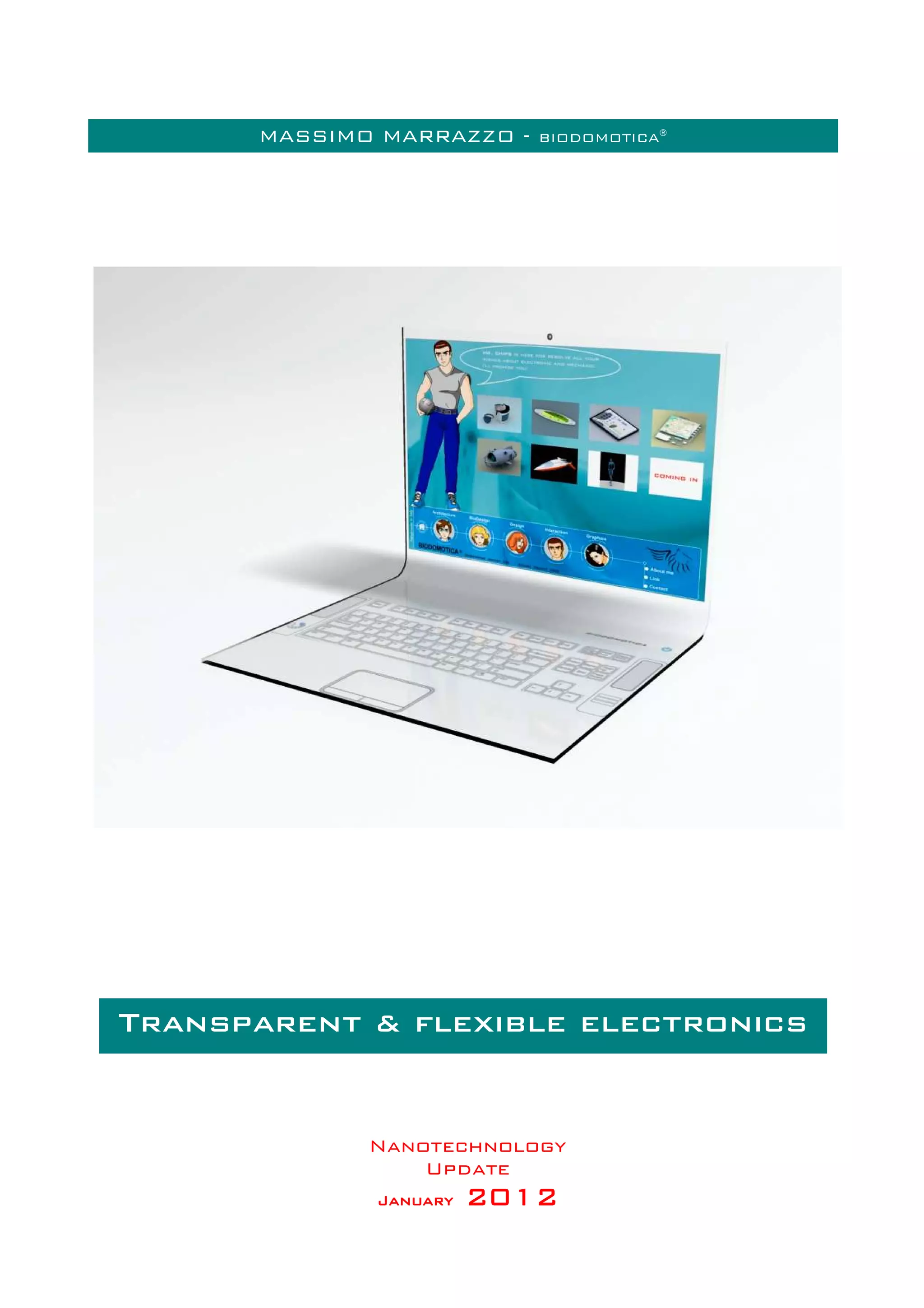 This document discusses advancements in transparent and flexible electronics, highlighting innovations such as Samsung's 22-inch transparent LCD panel, which is energy-efficient and versatile for various applications. It covers developments in transparent electrodes utilizing silver nanowires and graphene for stretchable devices, enhancing performance in electronics like OLEDs and solar cells. Additionally, it presents innovations in transparent batteries that could revolutionize mobile devices by supporting augmented reality applications.