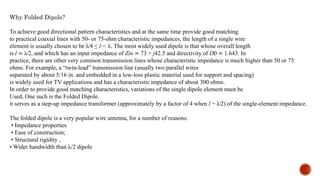 The document discusses the characteristics and applications of folded dipole antennas, highlighting their good directional patterns and matching capabilities to various transmission line impedances. It details the advantages of folded dipoles, such as their structural rigidity and wider bandwidth compared to standard dipoles. The analysis includes the relationship between input impedance and current distributions in the dipole structure.