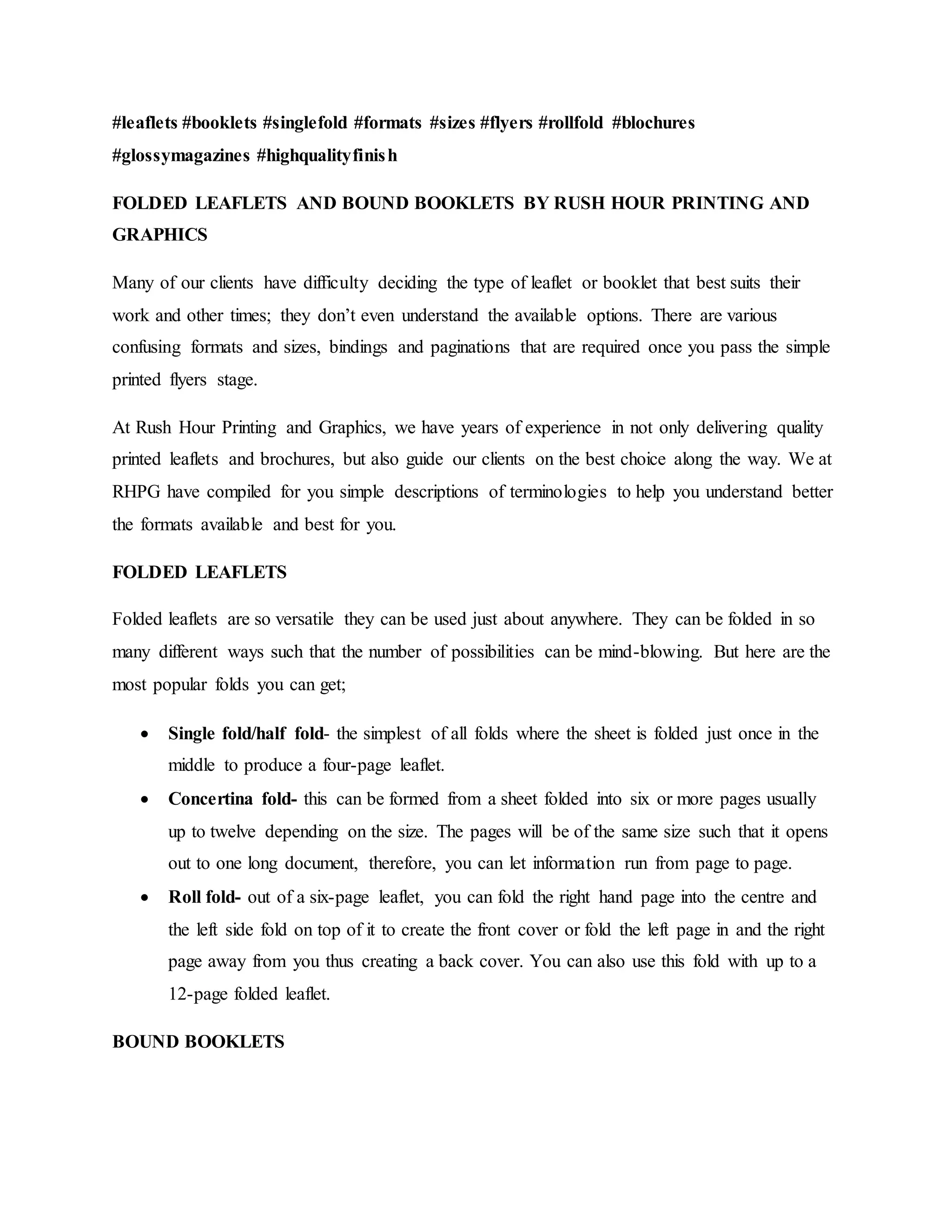 Folded leaflets and bound booklets come in various formats and sizes to suit different needs. Some common options include single or concertina folded leaflets and stitched, spiral, or perfect bound booklets. Rush Hour Printing provides printing services for these and guides clients to choose the best format. They describe popular leaflet folds like single or roll folds and booklet binding styles like stitched, spiral or perfect binds that vary in page counts and finishing quality. Rush Hour aims to help clients understand their options for communicating their message effectively.
