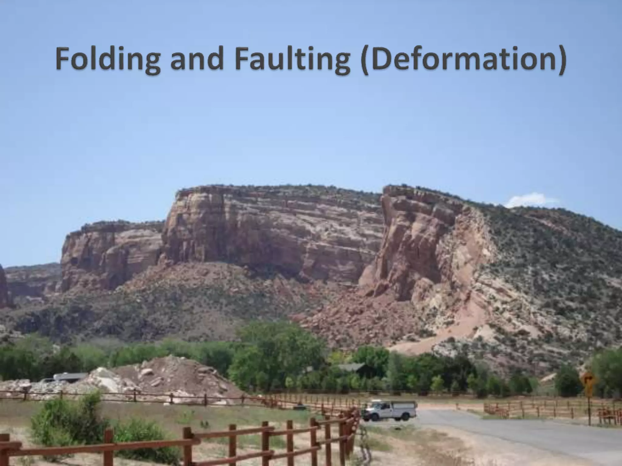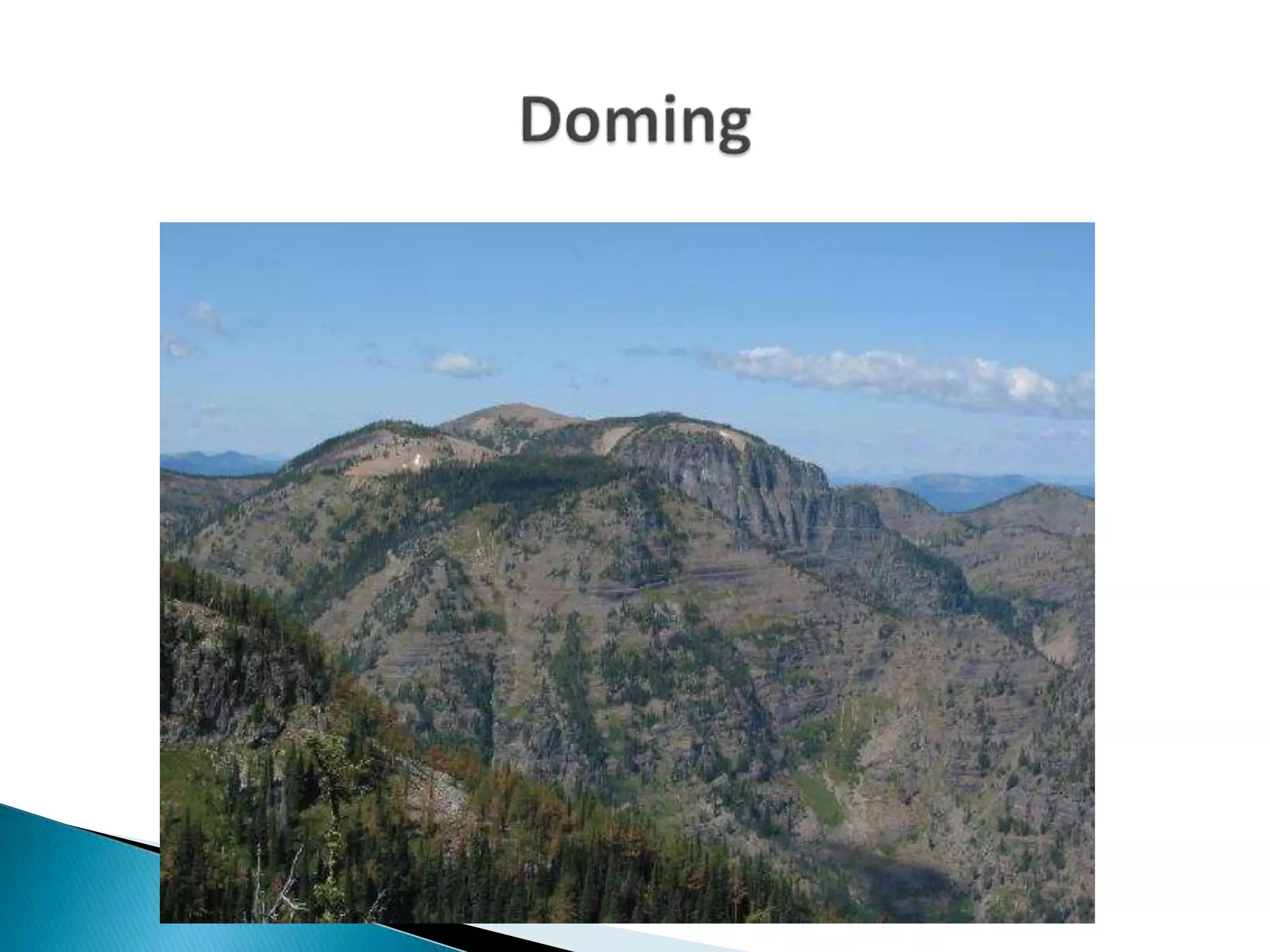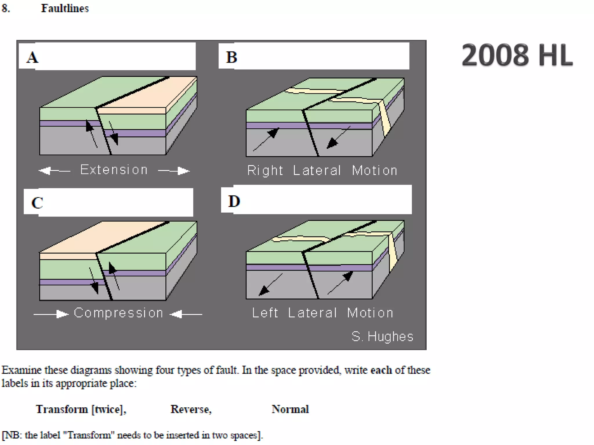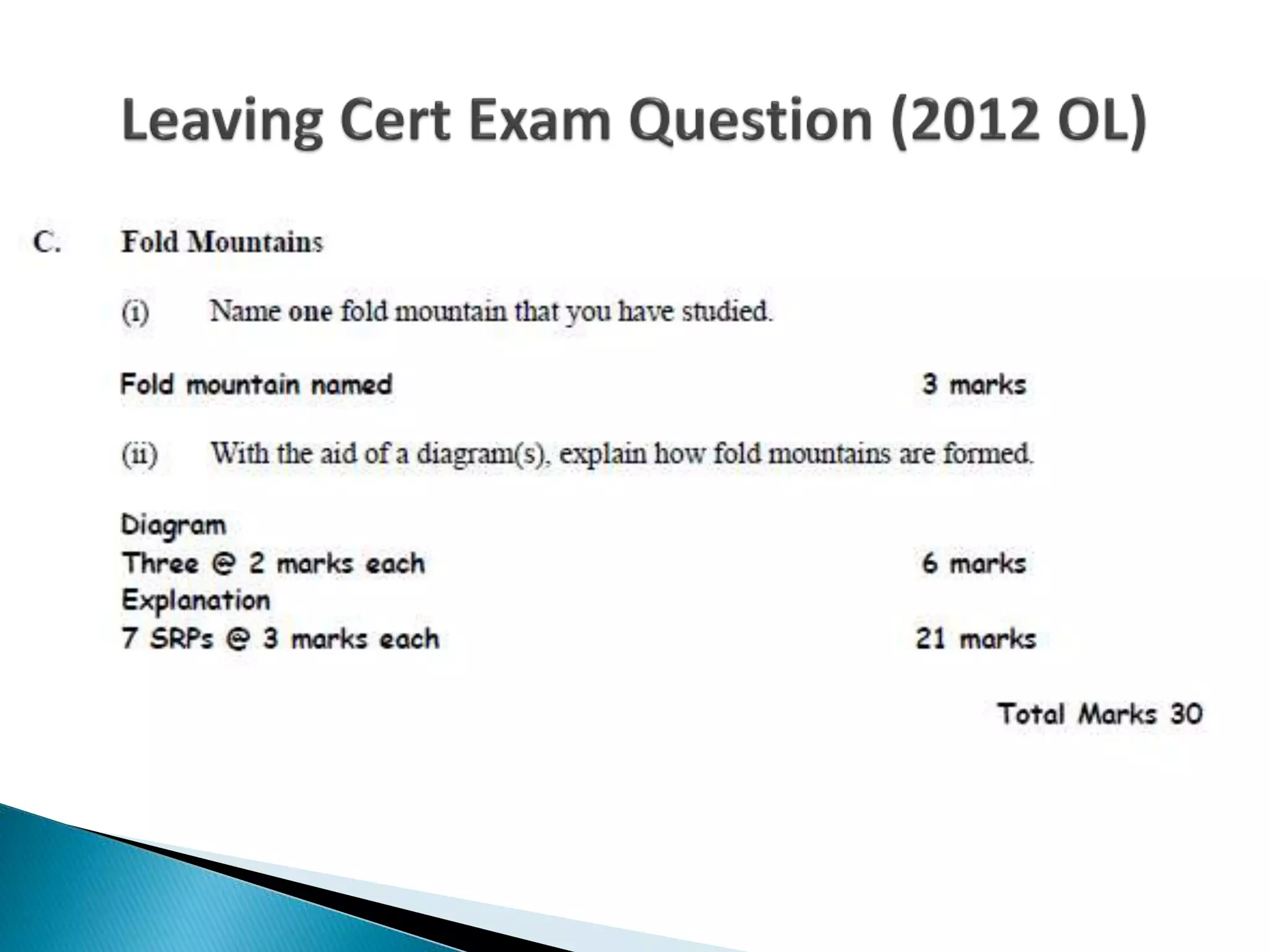 The document discusses geological processes of folding and faulting, describing how folding is a result of compression while faulting can occur due to compression, tension, or shearing. It highlights specific landforms such as synclines and anticlines, with examples from the landscape of Cork/Kerry, while also explaining types of faults: normal, reverse, thrust, and tear faults. The content emphasizes the importance of landscape impact and includes a marking scheme for assessing discussion on these processes.