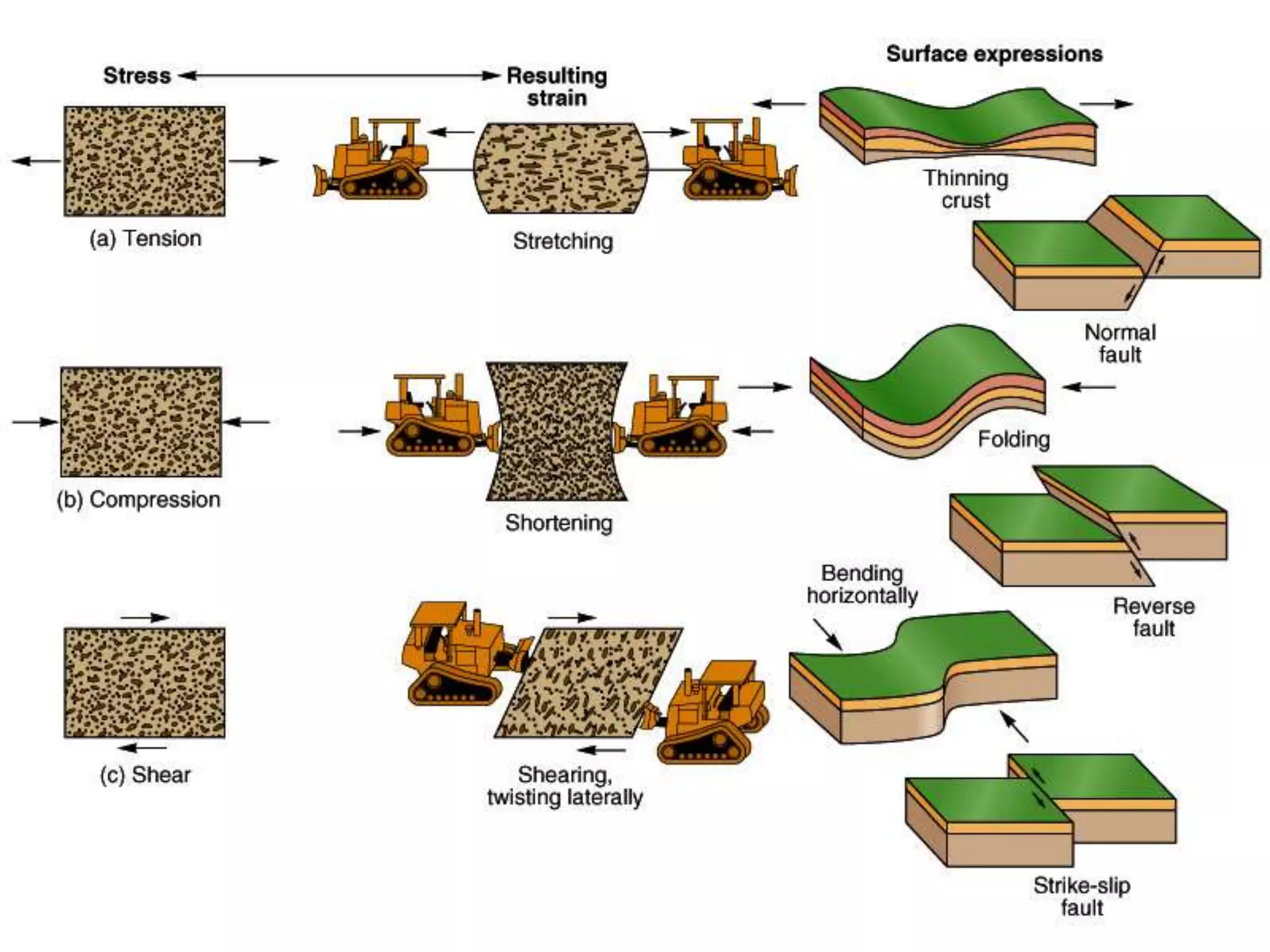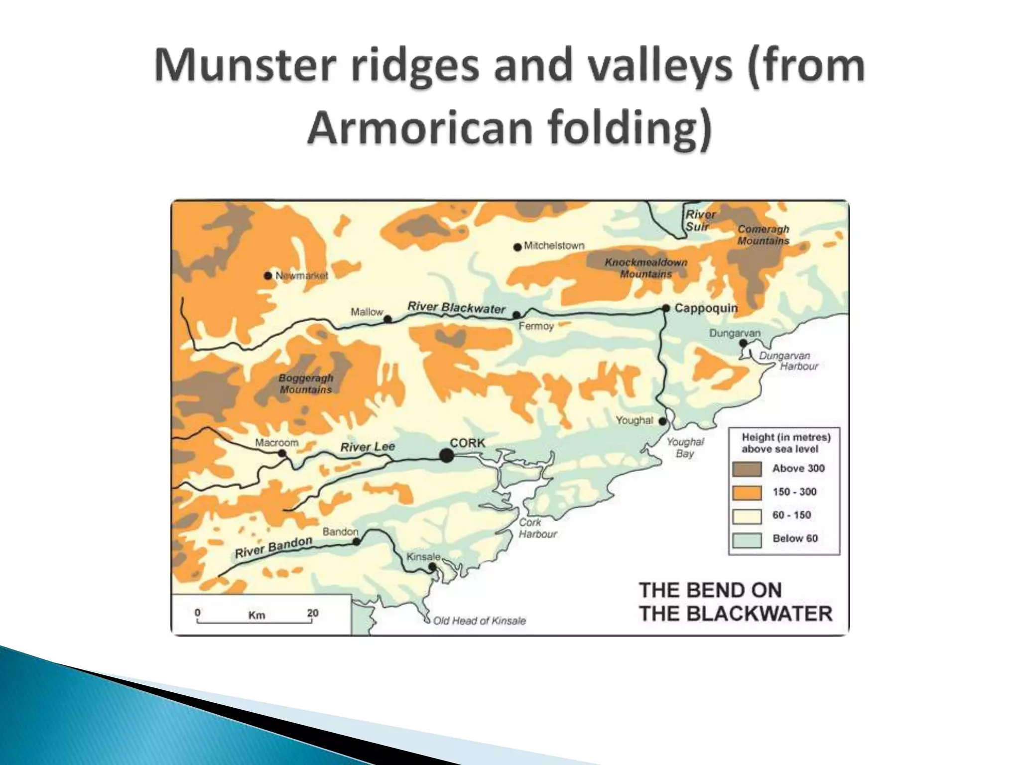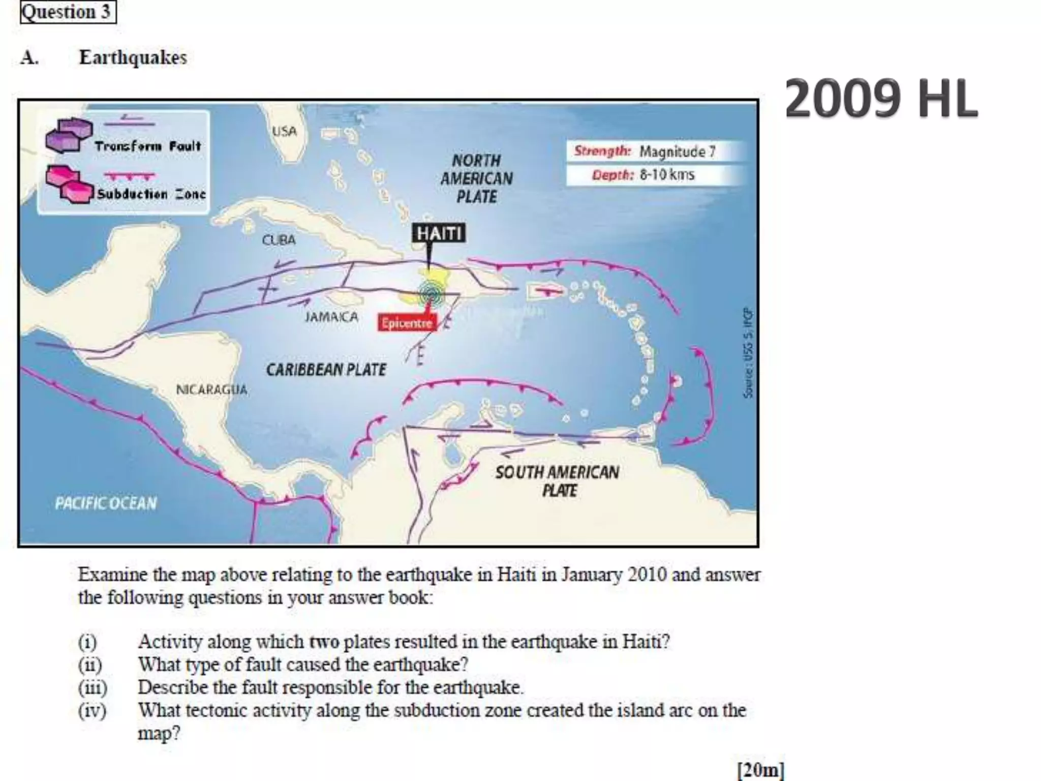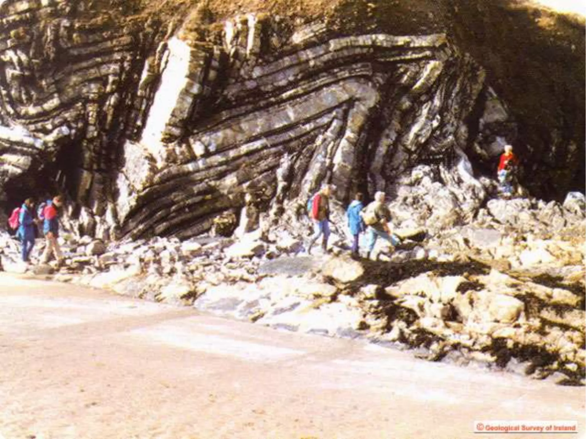 The document discusses geological processes of folding and faulting, describing how folding is a result of compression while faulting can occur due to compression, tension, or shearing. It highlights specific landforms such as synclines and anticlines, with examples from the landscape of Cork/Kerry, while also explaining types of faults: normal, reverse, thrust, and tear faults. The content emphasizes the importance of landscape impact and includes a marking scheme for assessing discussion on these processes.