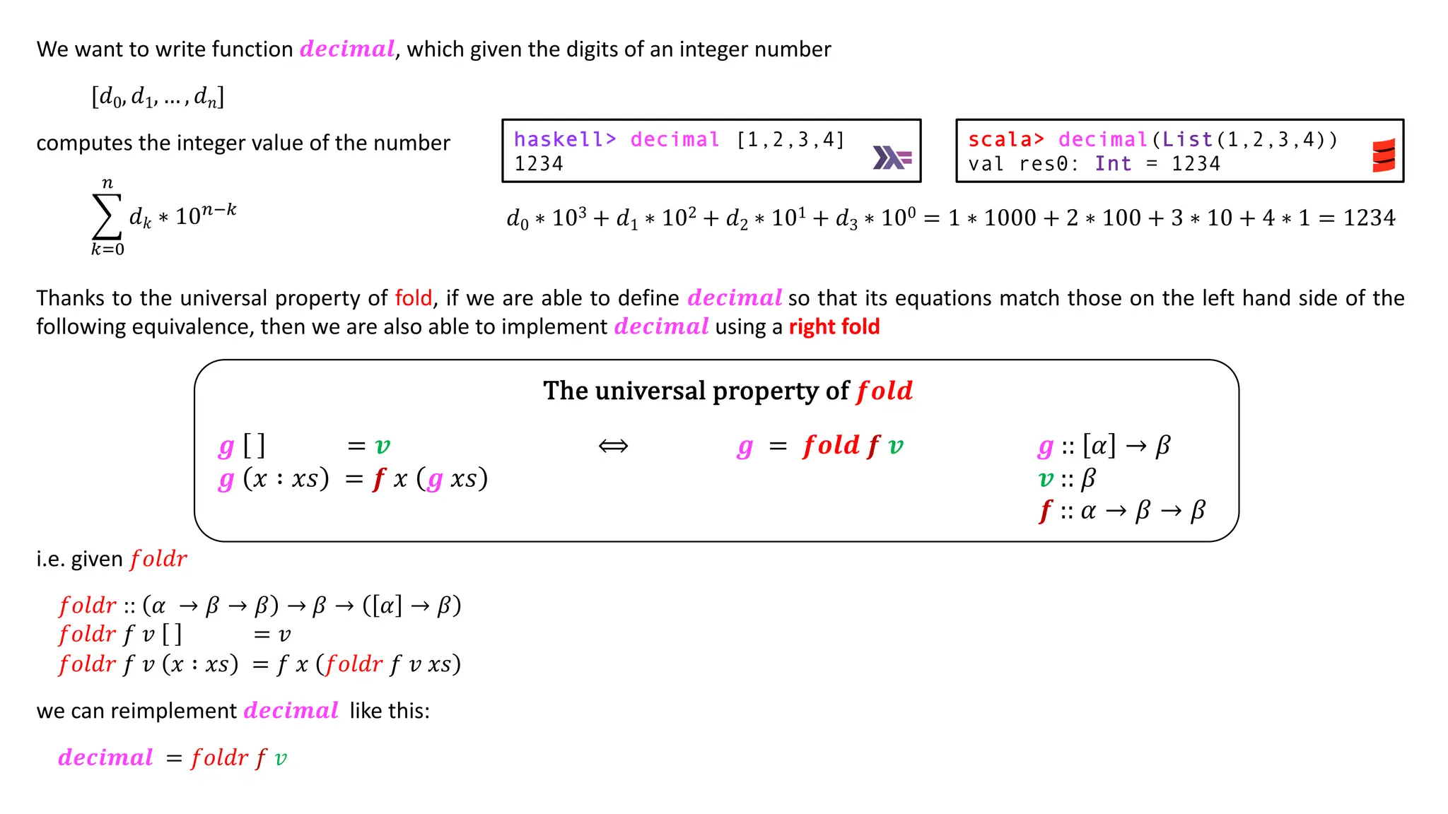 The document discusses the implementation of a decimal function that computes the integer value from a list of its digits using both right fold and left fold techniques. It emphasizes using Horner’s rule for efficiency and presents various iterations of the function's definition, comparing the complexity and mathematical efficiency of each. The left fold method is ultimately highlighted as the simpler and more efficient approach to define the decimal function.