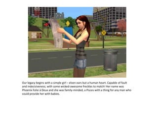 The document introduces the Folie á Deux legacy and the story of Generation 1. It summarizes that Phoenix and Timothy had a loving family together until one night Timothy turned into a werewolf and killed Phoenix in a rage. Their children Sydney, Alicia, Kaidan and India then escaped in a stolen car and Timothy later committed suicide with poison in the garden. The story is passed on to Jess to continue playing as Sydney and the Folie á Deux legacy.