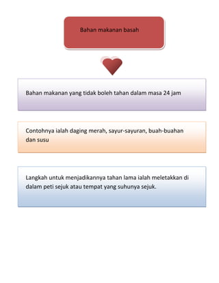 Dokumen ini membahas berbagai jenis makanan, termasuk ikan, daging, dan sayur-sayuran, serta cara penyimpanan dan memasak mereka. Terdapat penjelasan tentang klasifikasi jenis makanan, ciri-ciri, serta cara menguji kesegaran masing-masing. Informasi yang diberikan juga menjelaskan tentang nilai gizi dan cara penyimpanan yang tepat agar makanan tetap segar.