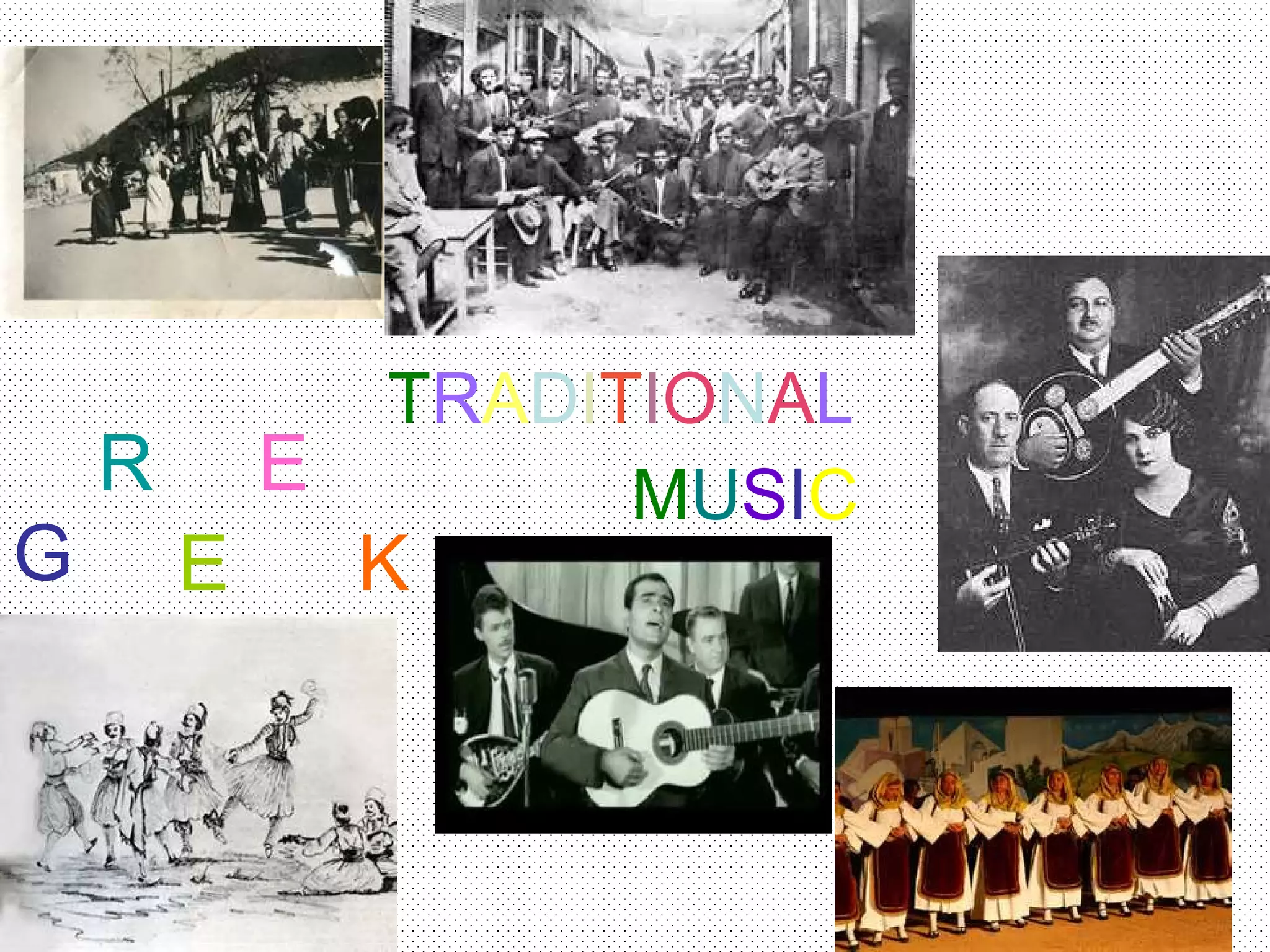 Traditional Greek songs are those composed anonymously and passed down over generations. They are divided into categories like lullabies, outdoor songs, and holiday songs based on their content. Kleptic songs emerged in the 16th century during Greek occupation and described the fight for freedom. Folk songs developed from an oral tradition as a way for people to express feelings and are based on the human need for expression.