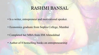 The document discusses 'Follow Every Rainbow' by Rashmi Bansal, which showcases the stories of 25 successful women entrepreneurs who overcame challenges to build their businesses and families. It highlights their unique perspectives on success, emphasizing that while women think and act differently than men, they can achieve immense success. The accounts include diverse experiences, from business creation to social advocacy, illustrating the transformative power of women's entrepreneurship.