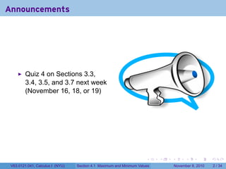 The document is a lecture note for a Calculus I course at New York University, focusing on maximum and minimum values, including concepts such as the extreme value theorem and Fermat's theorem. It outlines methods for finding extreme values of functions on closed intervals and discusses the significance of these values in optimization. The document also provides examples of continuous functions, illustrating cases where extreme values are achieved or not.