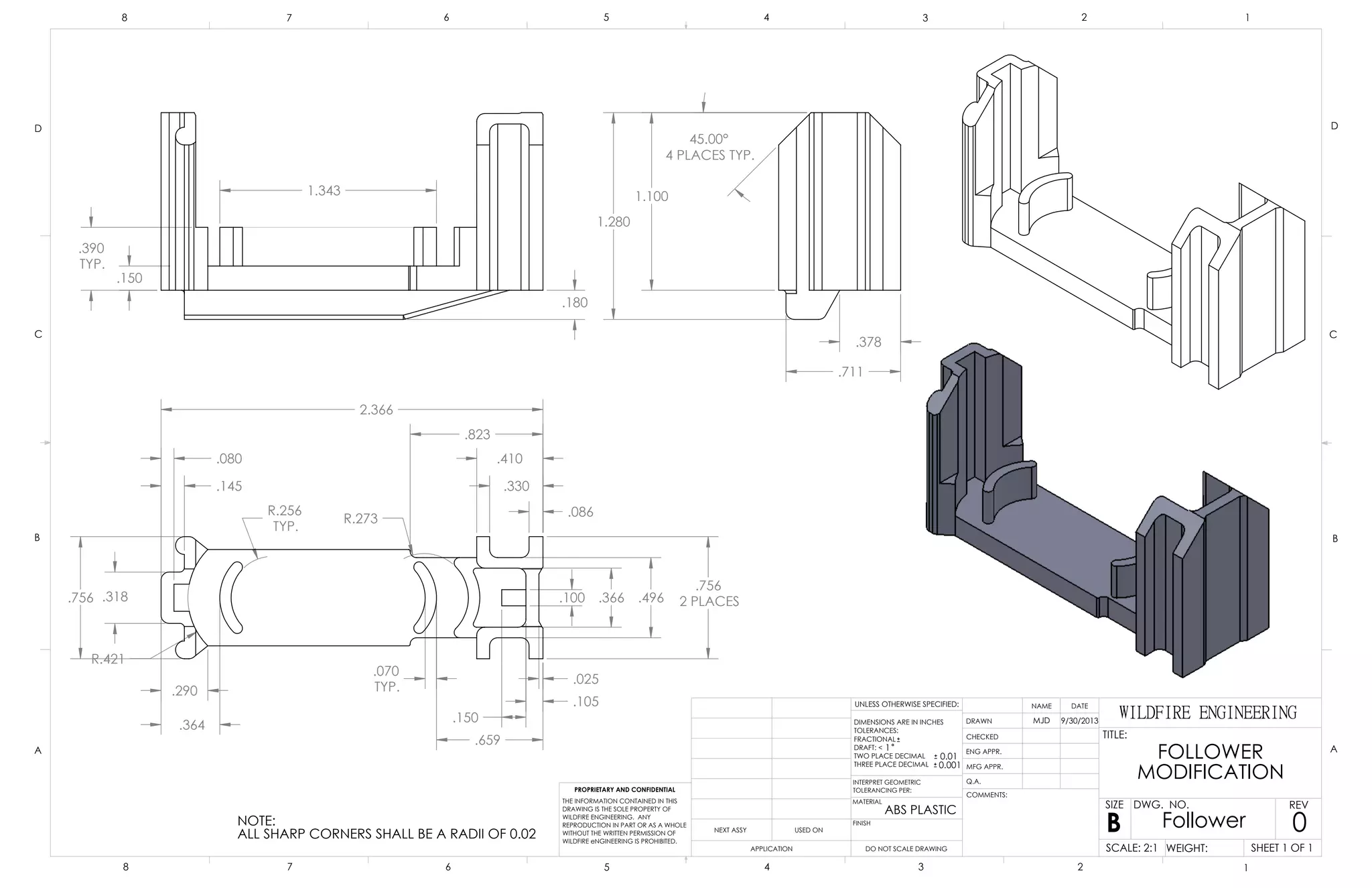 This document contains a technical drawing of a part called a "Follower" with multiple dimensions, tolerances, and notes specifying design details. Dimensions range from 0.001 to 2.366 inches with various tolerances and place values. Notes indicate that all sharp corners should have a 0.02 radius and proprietary information.