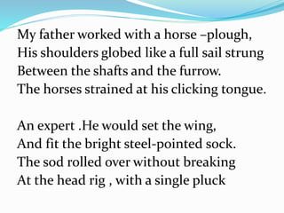 This poem describes a father working with horses to plough a field. The father's shoulders are broad like a sail between the horse shafts and the furrow. He expertly guides the horses with clicks of his tongue and sets the wing of the plough to cut the sod without breaking it, pulling it over with a single movement.