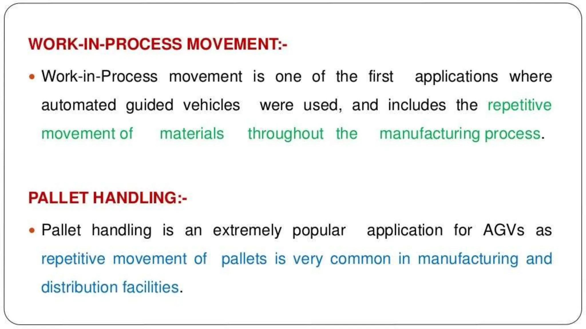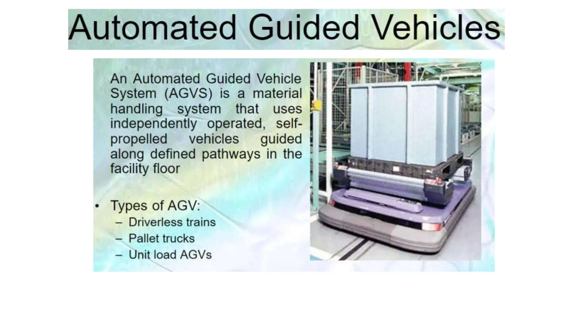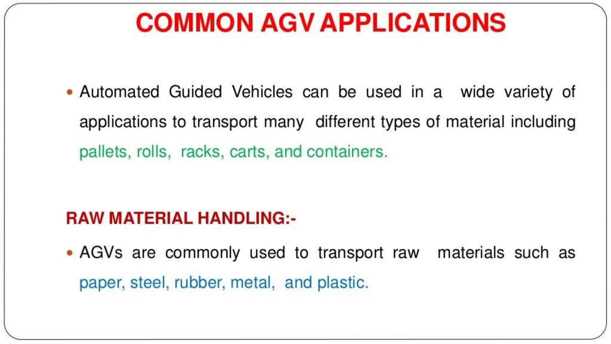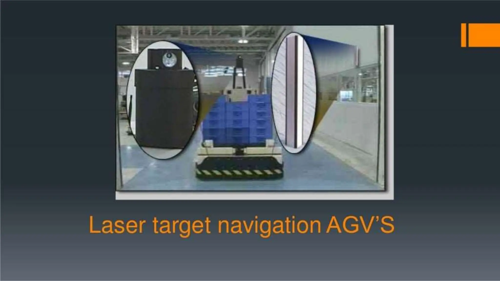 The rail-guided vehicle is utilized in warehouses to transport goods between distant areas along a fixed floor rail. It can support different load handling equipment, including telescopic forks and conveyors. The document discusses its applications in industrial robotics.