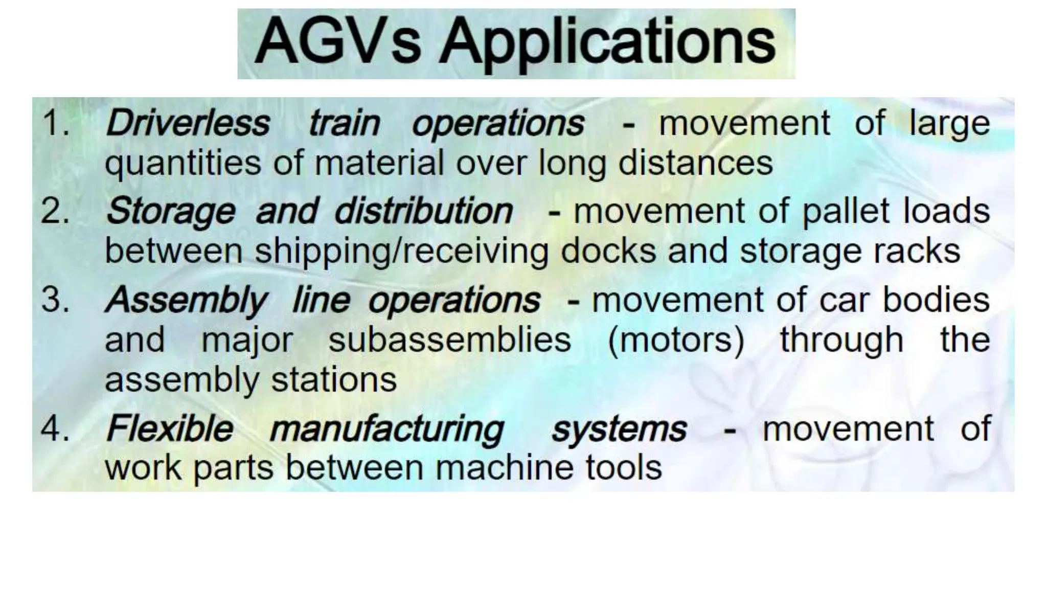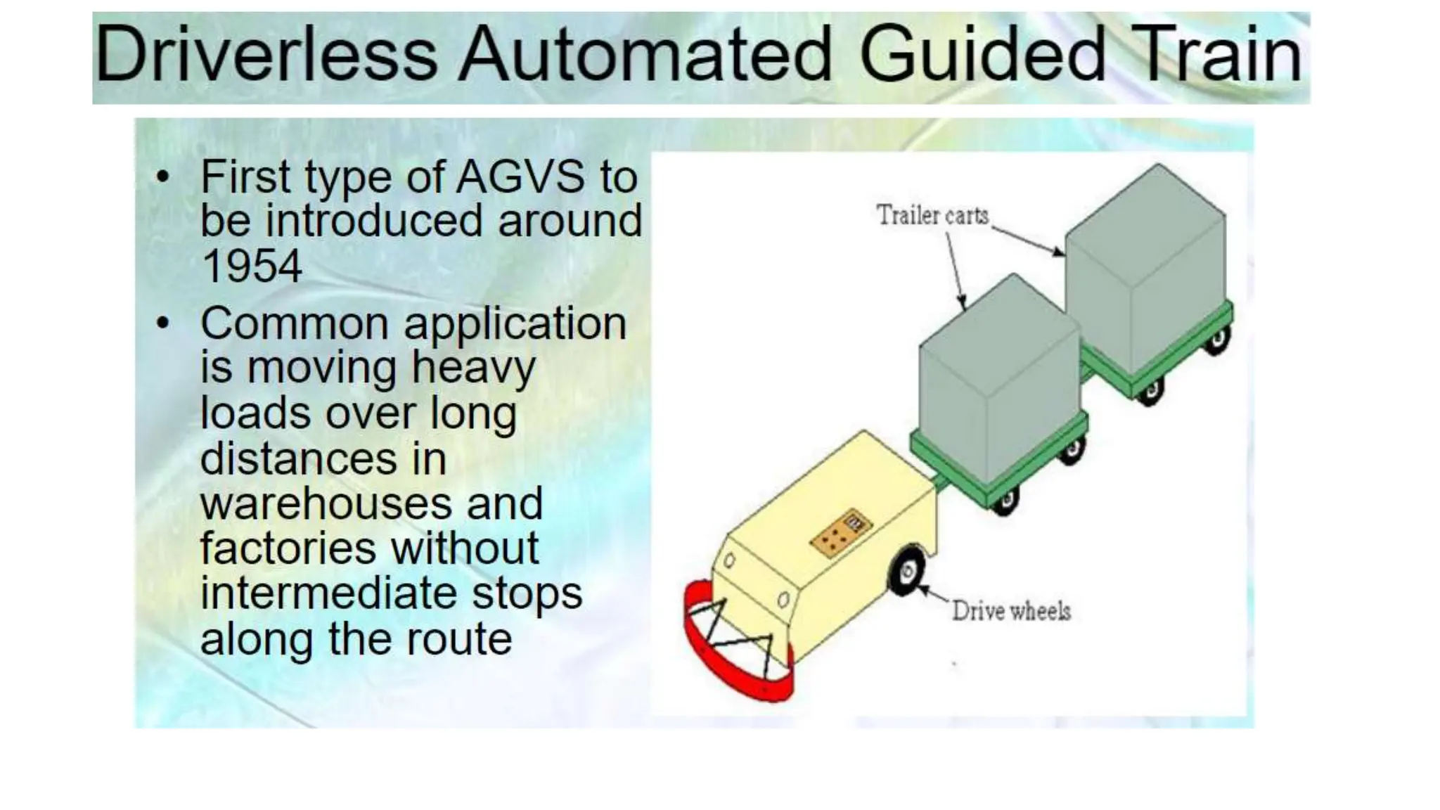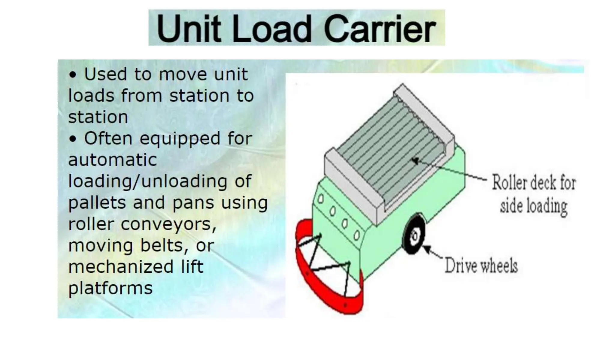 The rail-guided vehicle is utilized in warehouses to transport goods between distant areas along a fixed floor rail. It can support different load handling equipment, including telescopic forks and conveyors. The document discusses its applications in industrial robotics.