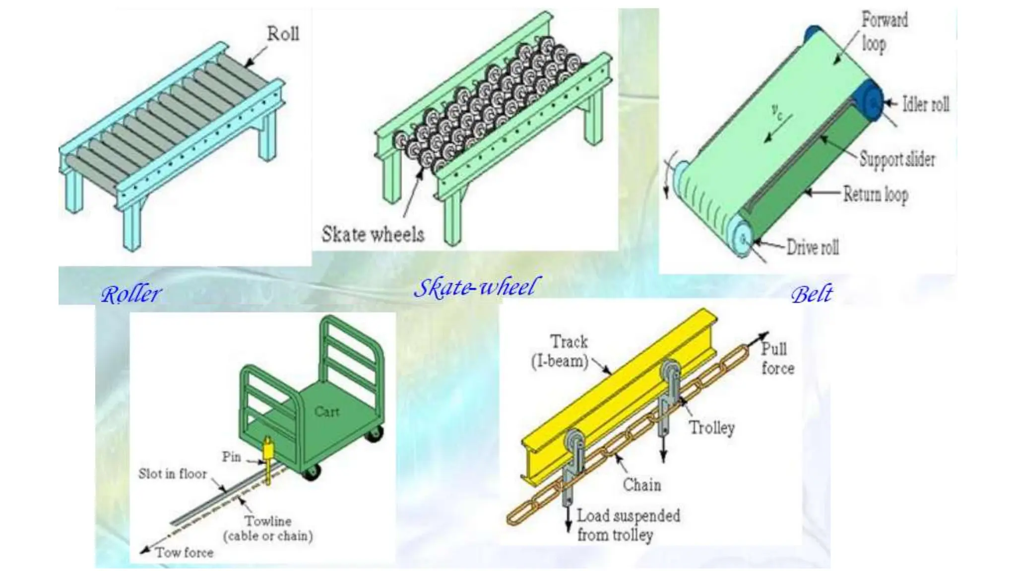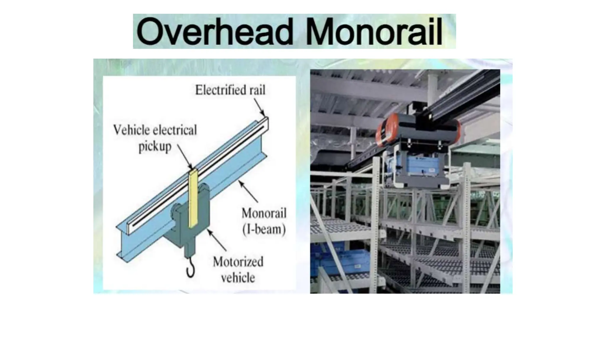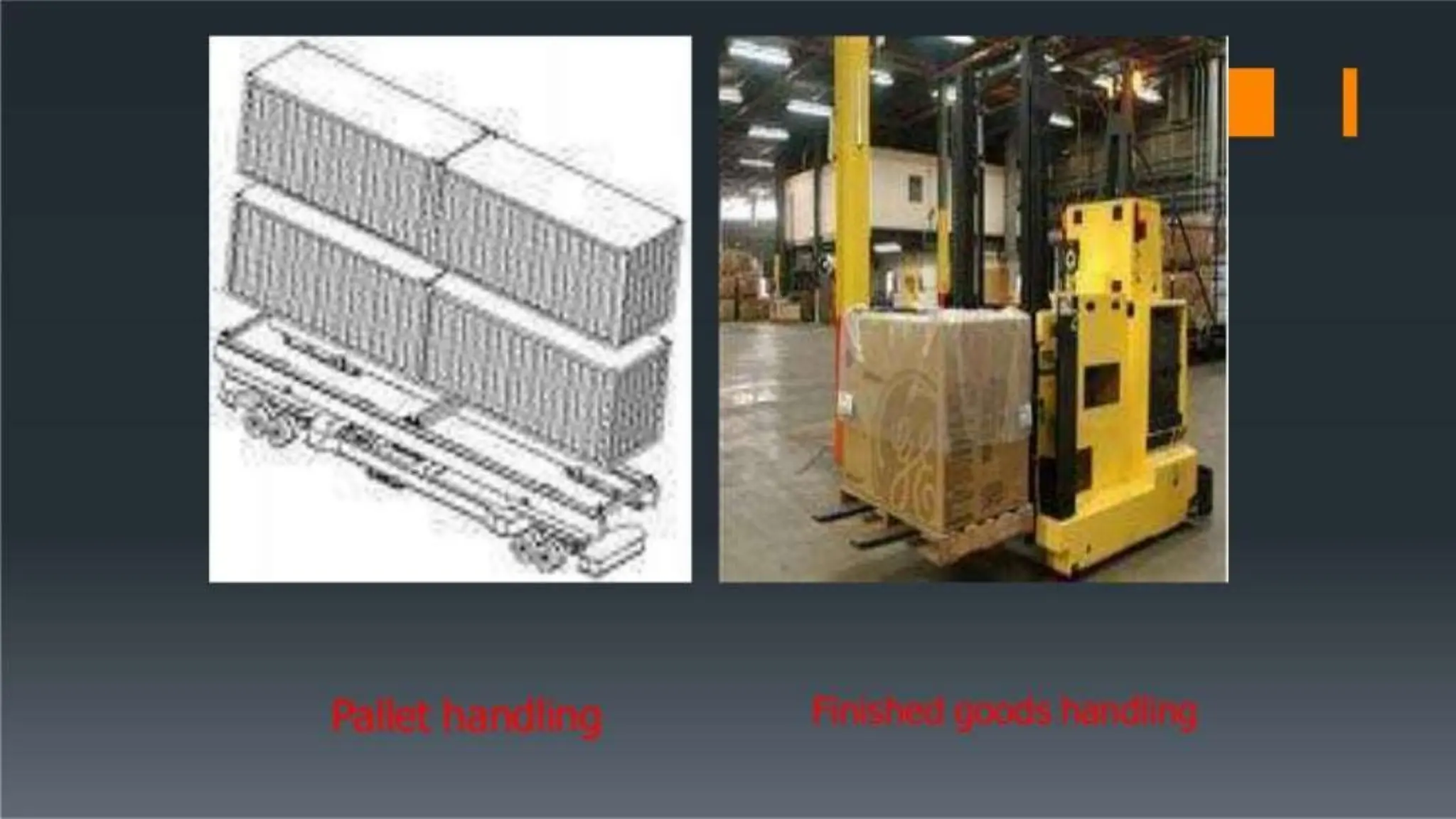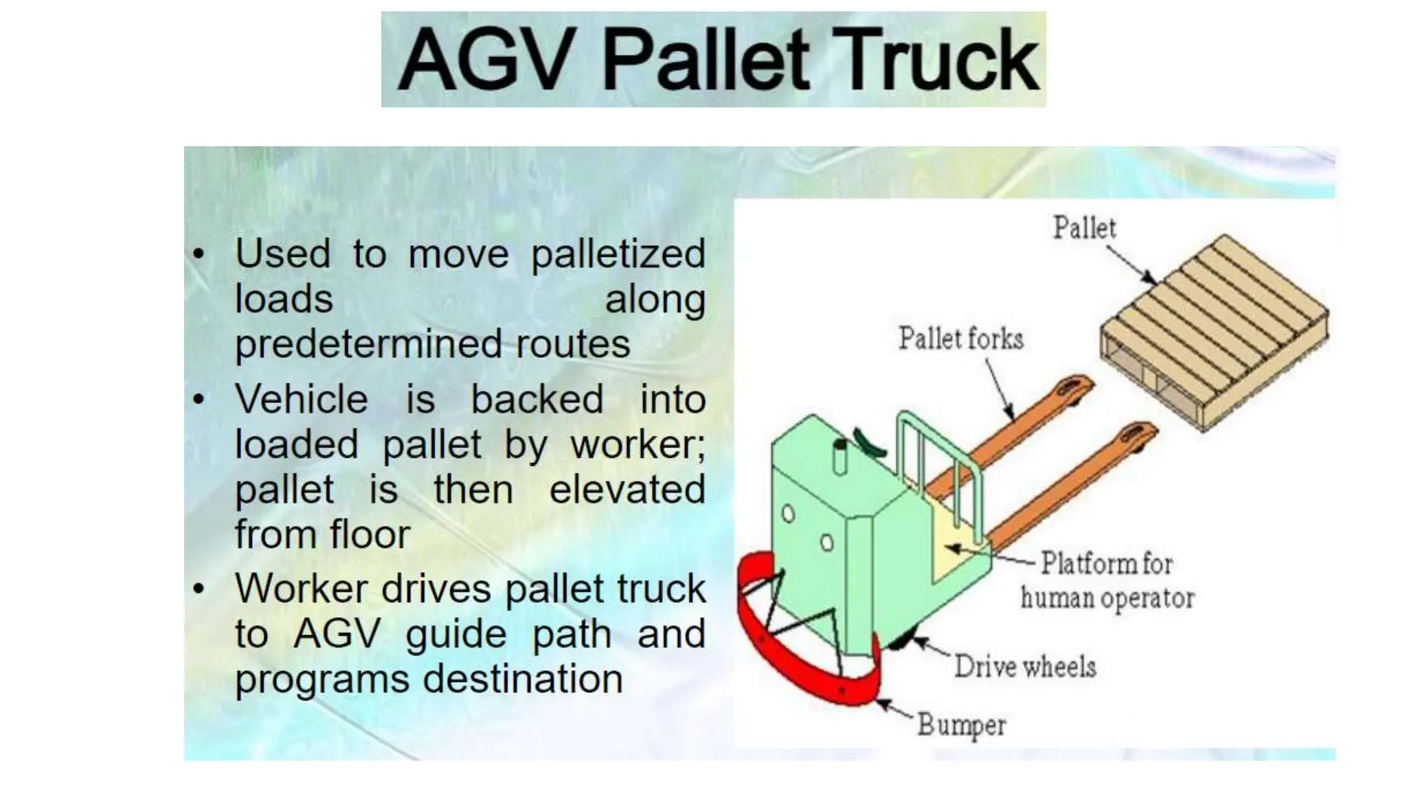 The rail-guided vehicle is utilized in warehouses to transport goods between distant areas along a fixed floor rail. It can support different load handling equipment, including telescopic forks and conveyors. The document discusses its applications in industrial robotics.