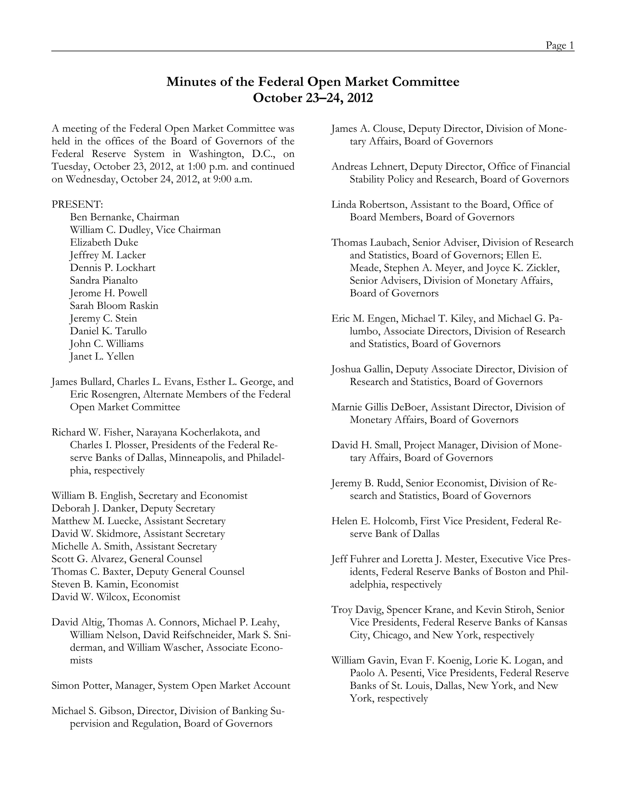 Page 1 _____________________________________________________________________________________________ Minutes of the Federal Open Market Committee October 23–24, 2012 A meeting of the Federal Open Market Committee was James A. Clouse, Deputy Director, Division of Mone- held in the offices of the Board of Governors of the tary Affairs, Board of Governors Federal Reserve System in Washington, D.C., on Tuesday, October 23, 2012, at 1:00 p.m. and continued Andreas Lehnert, Deputy Director, Office of Financial on Wednesday, October 24, 2012, at 9:00 a.m. Stability Policy and Research, Board of Governors PRESENT: Linda Robertson, Assistant to the Board, Office of Ben Bernanke, Chairman Board Members, Board of Governors William C. Dudley, Vice Chairman Elizabeth Duke Thomas Laubach, Senior Adviser, Division of Research Jeffrey M. Lacker and Statistics, Board of Governors; Ellen E. Dennis P. Lockhart Meade, Stephen A. Meyer, and Joyce K. Zickler, Sandra Pianalto Senior Advisers, Division of Monetary Affairs, Jerome H. Powell Board of Governors Sarah Bloom Raskin Jeremy C. Stein Eric M. Engen, Michael T. Kiley, and Michael G. Pa- Daniel K. Tarullo lumbo, Associate Directors, Division of Research John C. Williams and Statistics, Board of Governors Janet L. Yellen Joshua Gallin, Deputy Associate Director, Division of James Bullard, Charles L. Evans, Esther L. George, and Research and Statistics, Board of Governors Eric Rosengren, Alternate Members of the Federal Open Market Committee Marnie Gillis DeBoer, Assistant Director, Division of Monetary Affairs, Board of Governors Richard W. Fisher, Narayana Kocherlakota, and Charles I. Plosser, Presidents of the Federal Re- David H. Small, Project Manager, Division of Mone- serve Banks of Dallas, Minneapolis, and Philadel- tary Affairs, Board of Governors phia, respectively Jeremy B. Rudd, Senior Economist, Division of Re- William B. English, Secretary and Economist search and Statistics, Board of Governors Deborah J. Danker, Deputy Secretary Matthew M. Luecke, Assistant Secretary Helen E. Holcomb, First Vice President, Federal Re- David W. Skidmore, Assistant Secretary serve Bank of Dallas Michelle A. Smith, Assistant Secretary Scott G. Alvarez, General Counsel Jeff Fuhrer and Loretta J. Mester, Executive Vice Pres- Thomas C. Baxter, Deputy General Counsel idents, Federal Reserve Banks of Boston and Phil- Steven B. Kamin, Economist adelphia, respectively David W. Wilcox, Economist Troy Davig, Spencer Krane, and Kevin Stiroh, Senior David Altig, Thomas A. Connors, Michael P. Leahy, Vice Presidents, Federal Reserve Banks of Kansas William Nelson, David Reifschneider, Mark S. Sni- City, Chicago, and New York, respectively derman, and William Wascher, Associate Econo- mists William Gavin, Evan F. Koenig, Lorie K. Logan, and Paolo A. Pesenti, Vice Presidents, Federal Reserve Simon Potter, Manager, System Open Market Account Banks of St. Louis, Dallas, New York, and New York, respectively Michael S. Gibson, Director, Division of Banking Su- pervision and Regulation, Board of Governors