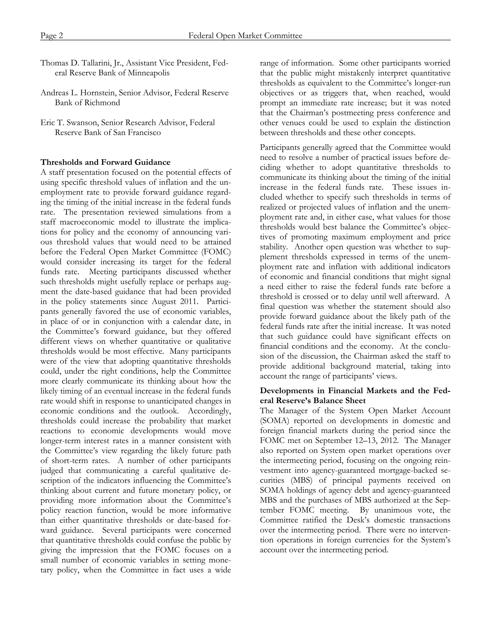 Page 2 Federal Open Market Committee _____________________________________________________________________________________________ Thomas D. Tallarini, Jr., Assistant Vice President, Fed- range of information. Some other participants worried eral Reserve Bank of Minneapolis that the public might mistakenly interpret quantitative thresholds as equivalent to the Committee’s longer-run Andreas L. Hornstein, Senior Advisor, Federal Reserve objectives or as triggers that, when reached, would Bank of Richmond prompt an immediate rate increase; but it was noted that the Chairman’s postmeeting press conference and Eric T. Swanson, Senior Research Advisor, Federal other venues could be used to explain the distinction Reserve Bank of San Francisco between thresholds and these other concepts. Participants generally agreed that the Committee would need to resolve a number of practical issues before de- Thresholds and Forward Guidance ciding whether to adopt quantitative thresholds to A staff presentation focused on the potential effects of communicate its thinking about the timing of the initial using specific threshold values of inflation and the un- increase in the federal funds rate. These issues in- employment rate to provide forward guidance regard- cluded whether to specify such thresholds in terms of ing the timing of the initial increase in the federal funds realized or projected values of inflation and the unem- rate. The presentation reviewed simulations from a ployment rate and, in either case, what values for those staff macroeconomic model to illustrate the implica- thresholds would best balance the Committee’s objec- tions for policy and the economy of announcing vari- tives of promoting maximum employment and price ous threshold values that would need to be attained stability. Another open question was whether to sup- before the Federal Open Market Committee (FOMC) plement thresholds expressed in terms of the unem- would consider increasing its target for the federal ployment rate and inflation with additional indicators funds rate. Meeting participants discussed whether of economic and financial conditions that might signal such thresholds might usefully replace or perhaps aug- a need either to raise the federal funds rate before a ment the date-based guidance that had been provided threshold is crossed or to delay until well afterward. A in the policy statements since August 2011. Partici- final question was whether the statement should also pants generally favored the use of economic variables, provide forward guidance about the likely path of the in place of or in conjunction with a calendar date, in federal funds rate after the initial increase. It was noted the Committee’s forward guidance, but they offered that such guidance could have significant effects on different views on whether quantitative or qualitative financial conditions and the economy. At the conclu- thresholds would be most effective. Many participants sion of the discussion, the Chairman asked the staff to were of the view that adopting quantitative thresholds provide additional background material, taking into could, under the right conditions, help the Committee account the range of participants’ views. more clearly communicate its thinking about how the likely timing of an eventual increase in the federal funds Developments in Financial Markets and the Fed- rate would shift in response to unanticipated changes in eral Reserve’s Balance Sheet economic conditions and the outlook. Accordingly, The Manager of the System Open Market Account thresholds could increase the probability that market (SOMA) reported on developments in domestic and reactions to economic developments would move foreign financial markets during the period since the longer-term interest rates in a manner consistent with FOMC met on September 12–13, 2012. The Manager the Committee’s view regarding the likely future path also reported on System open market operations over of short-term rates. A number of other participants the intermeeting period, focusing on the ongoing rein- judged that communicating a careful qualitative de- vestment into agency-guaranteed mortgage-backed se- scription of the indicators influencing the Committee’s curities (MBS) of principal payments received on thinking about current and future monetary policy, or SOMA holdings of agency debt and agency-guaranteed providing more information about the Committee’s MBS and the purchases of MBS authorized at the Sep- policy reaction function, would be more informative tember FOMC meeting. By unanimous vote, the than either quantitative thresholds or date-based for- Committee ratified the Desk’s domestic transactions ward guidance. Several participants were concerned over the intermeeting period. There were no interven- that quantitative thresholds could confuse the public by tion operations in foreign currencies for the System’s giving the impression that the FOMC focuses on a account over the intermeeting period. small number of economic variables in setting mone- tary policy, when the Committee in fact uses a wide