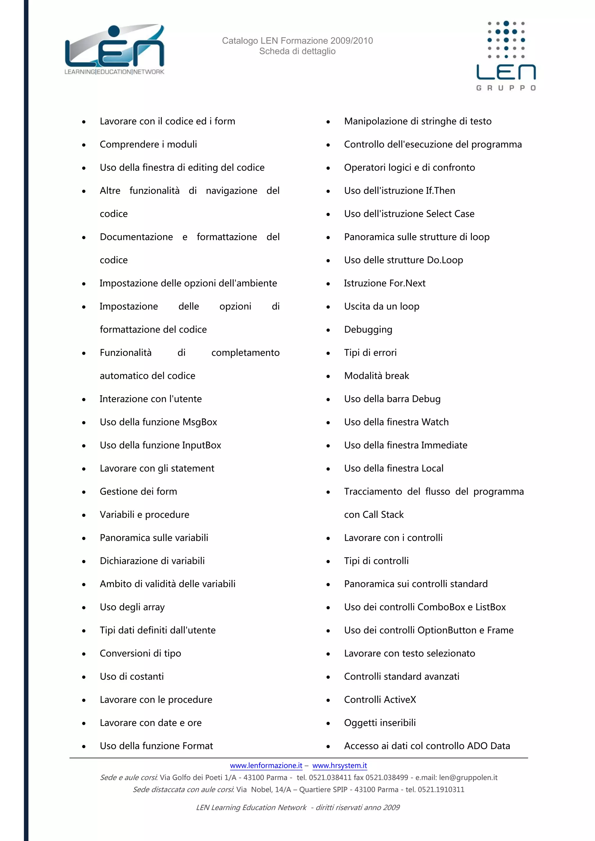 Il documento descrive il corso di formazione su Microsoft Visual Basic 6.0 offerto da LEN per l'anno 2009/2010, della durata di 40 ore. Il corso è rivolto a chi desidera apprendere la programmazione in Visual Basic, affrontando argomenti come la programmazione event-driven, l'uso di controlli e debugging. Al termine del corso, i partecipanti saranno in grado di sviluppare applicazioni e gestire interfacce utente efficaci.