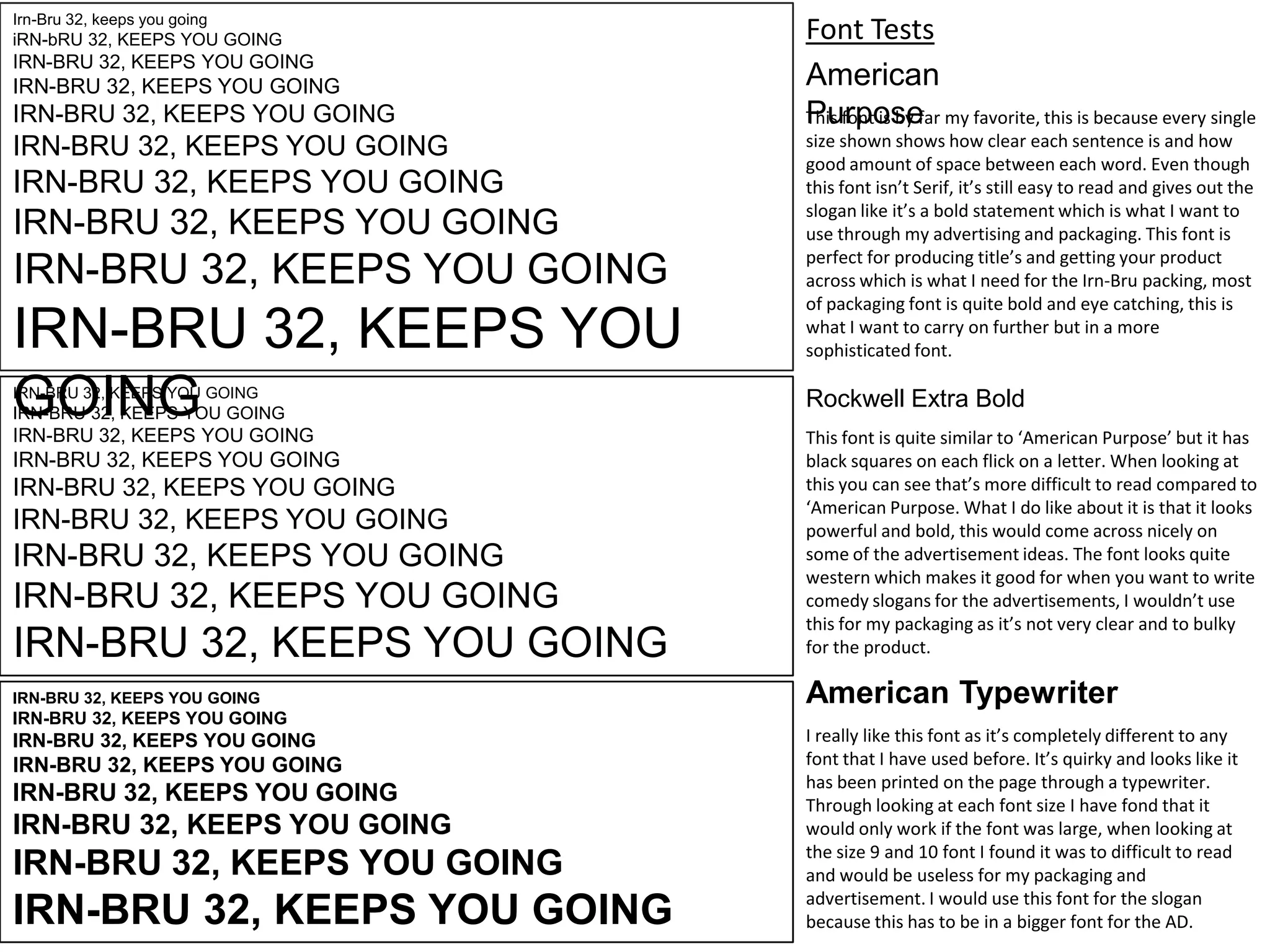 The document discusses font and packaging design options for a new Irn-Bru energy drink product. It evaluates several fonts for suitability for packaging labels and advertisements. The "Hand of Sean" font is identified as the best option for labels because it is bold, clear, and catches attention. For advertisements, the same font works well in green on a white background. A 500ml tall can size is selected to be consistent with competitors. The final can design concept features a blue background with a small central gray box and splattered paint effect to distinguish it from traditional Irn-Bru cans.