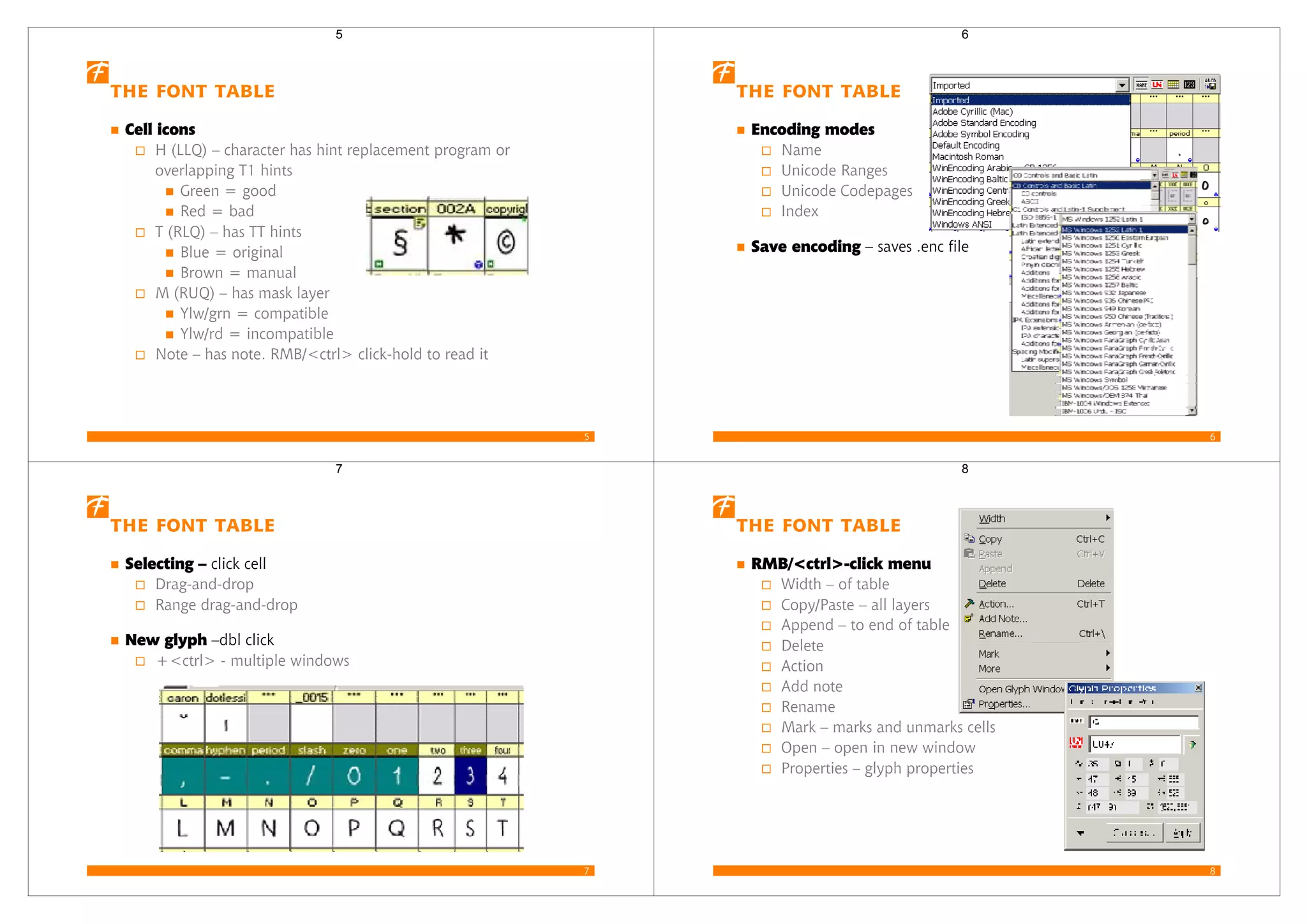 The font table in FontLab Studio displays information about glyphs and allows editing characters. Cells are color coded to indicate encoding status. Context menus provide glyph editing and encoding options.