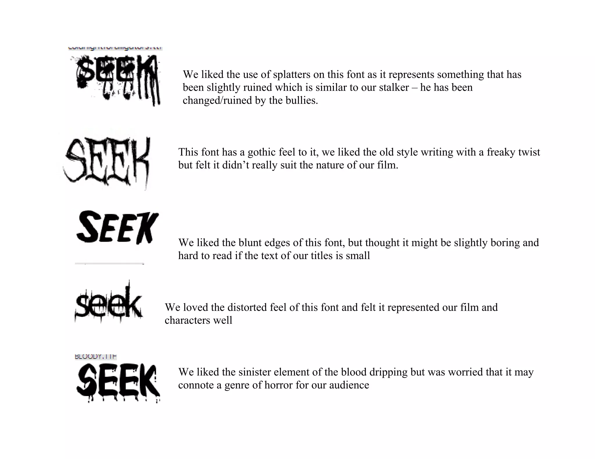This document discusses different font options for a film title, summarizing the pros and cons of each. It likes how one font uses splatters to represent a character changed by bullies, and another's distorted feel represents the film and characters well, though it worries another with blood dripping may imply a horror genre which does not suit their film.