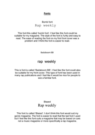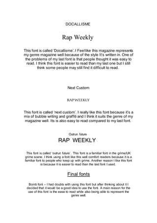 The document evaluates several fonts for suitability in a rap magazine masthead. It discusses the fonts "Bomb font", "Badaboom BB", "Blazed", "Docallisme", "Next Custom", and "Outrun future". The author selects Bomb font, Badaboom font, Next custom font, and Outrun future font for the magazine based on readability, representation of the genre, and familiarity to the target audience from prior music videos.