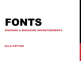 The document discusses font choices for album covers and how they portray the music's style and themes. It provides examples of fonts for different genres and target audiences. Bold, simplistic fonts are best for digipaks to draw attention. Handwritten fonts on albums tackling personal issues imply honesty. Cartoon-like, animated fonts suit creative artists by linking to their music's tone in an artistic way. Tracklist fonts are small and simple as extra text is less important. Fonts should correlate with the image and target audience's expected age and gender.